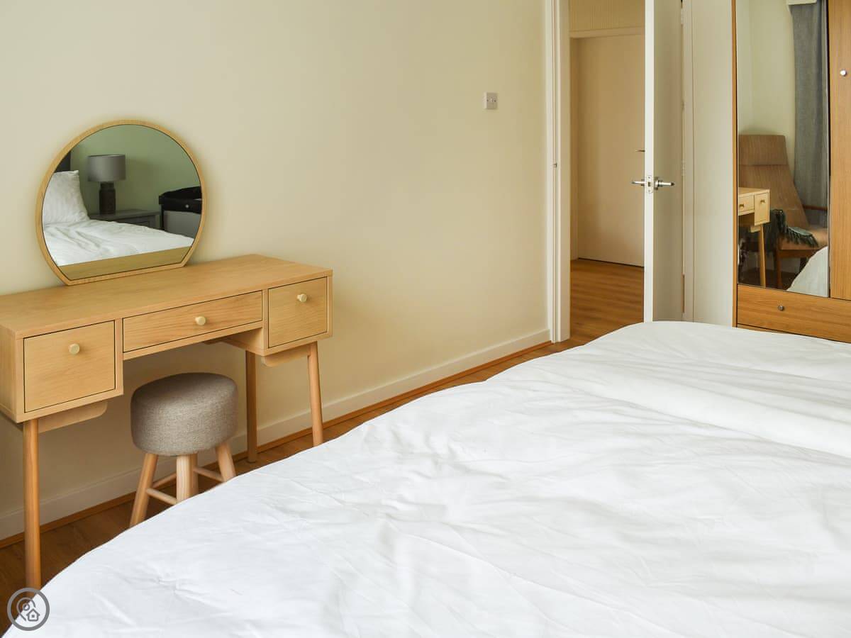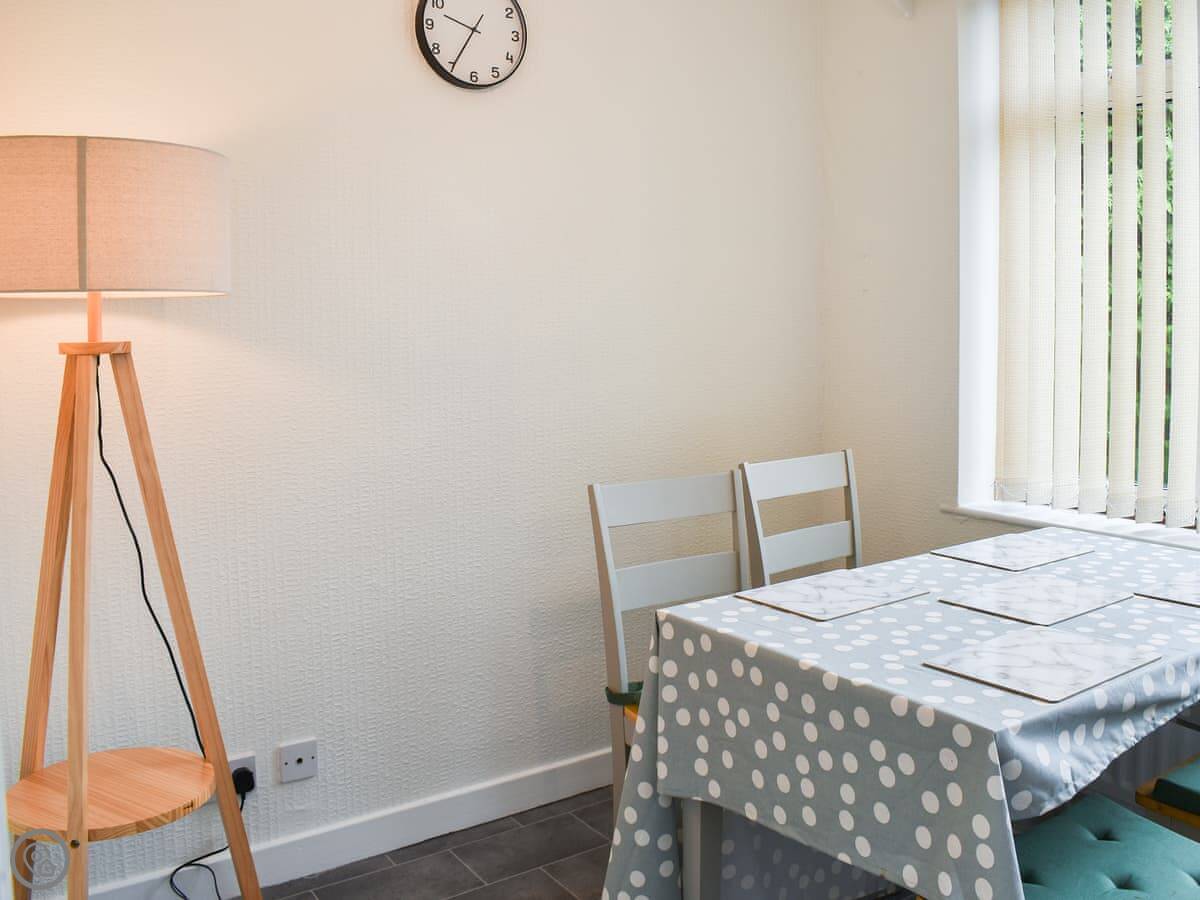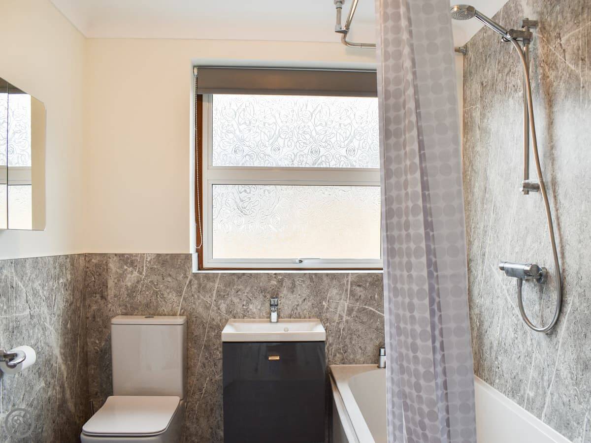 It sleeps four. There are two bedrooms on the ground floor. One has a double bed, the other has a zip-and-link bed that can be either a king-size or two singles. One bathroom with a shower over the bath. It's got a 3 Star rating, which means it's clean, comfortable and everything works, but it's not luxury. The entrance and the main rooms are wheelchair accessible.