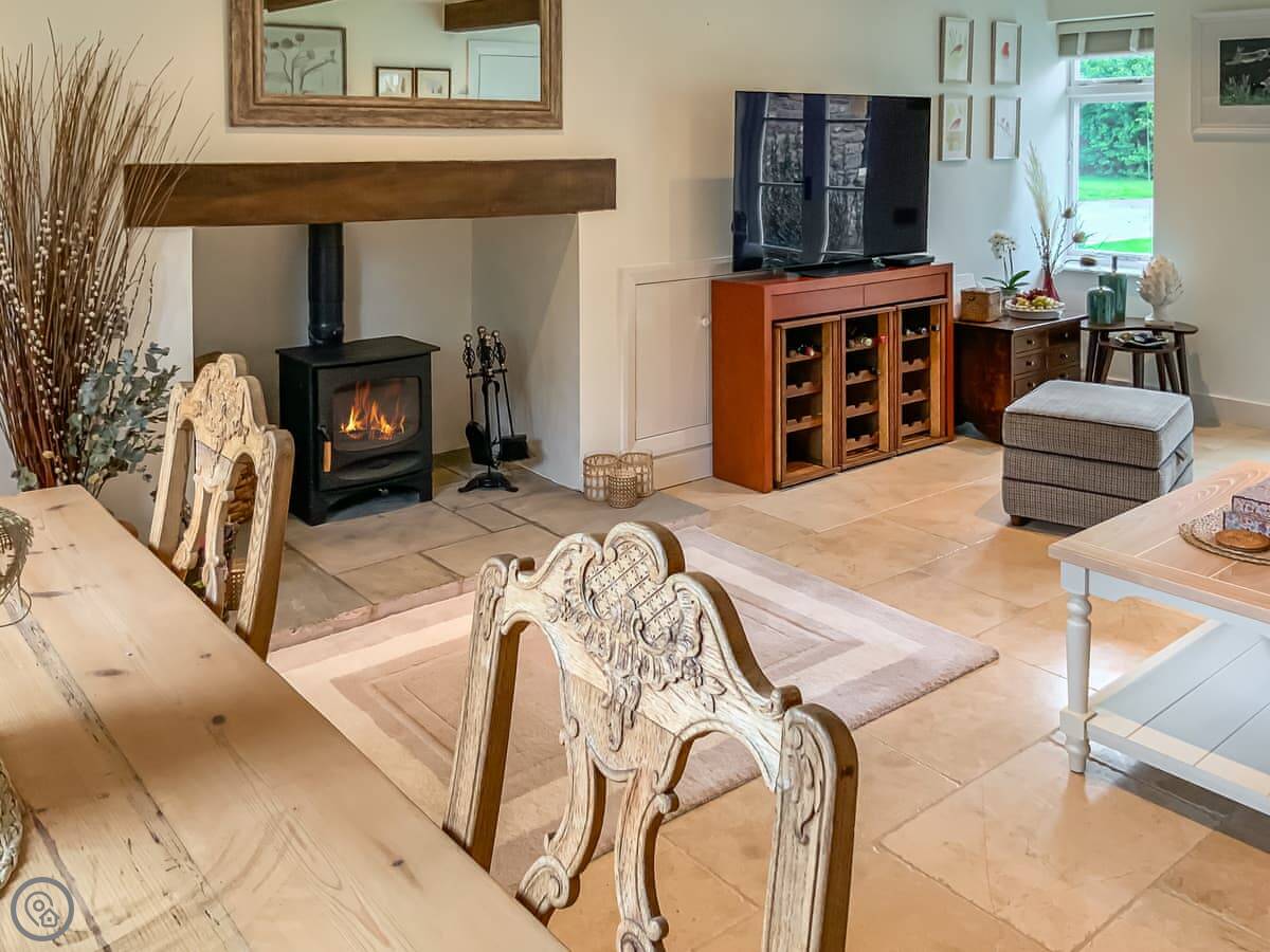 Inside, it's comfortable. There's a woodburner in the living room and a Smart TV with Sky. The kitchen has a dishwasher and a washing machine.