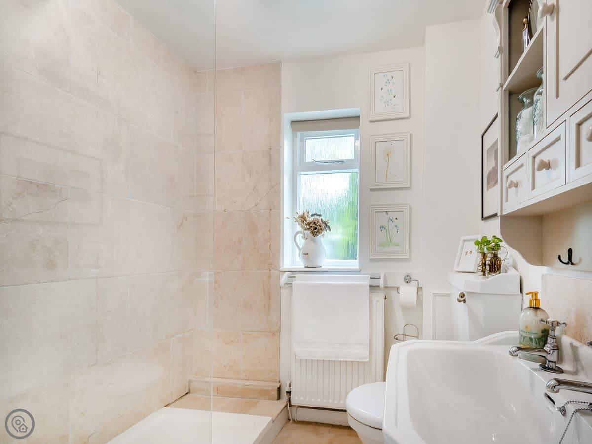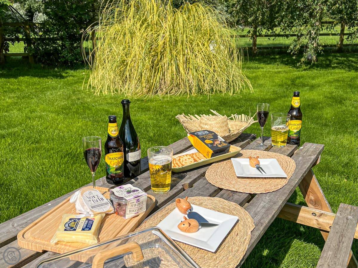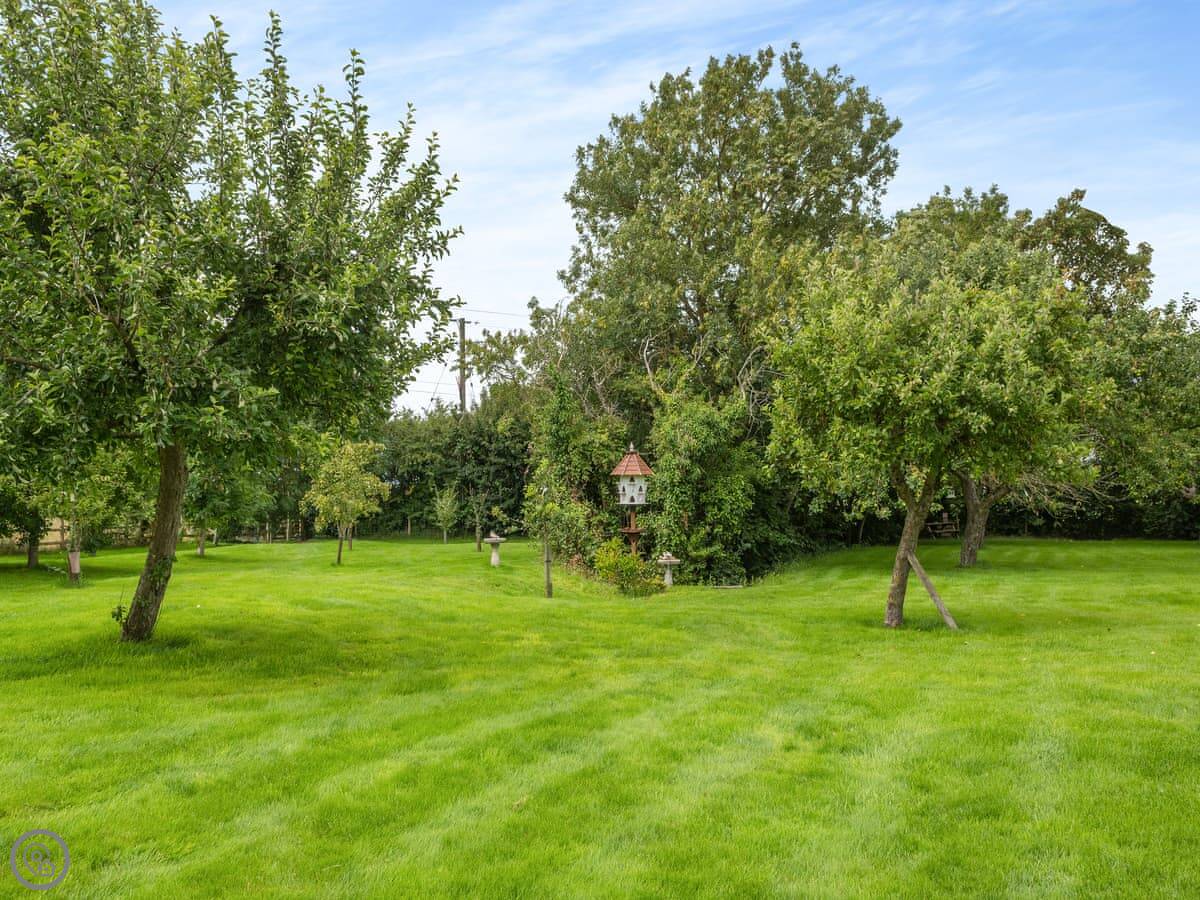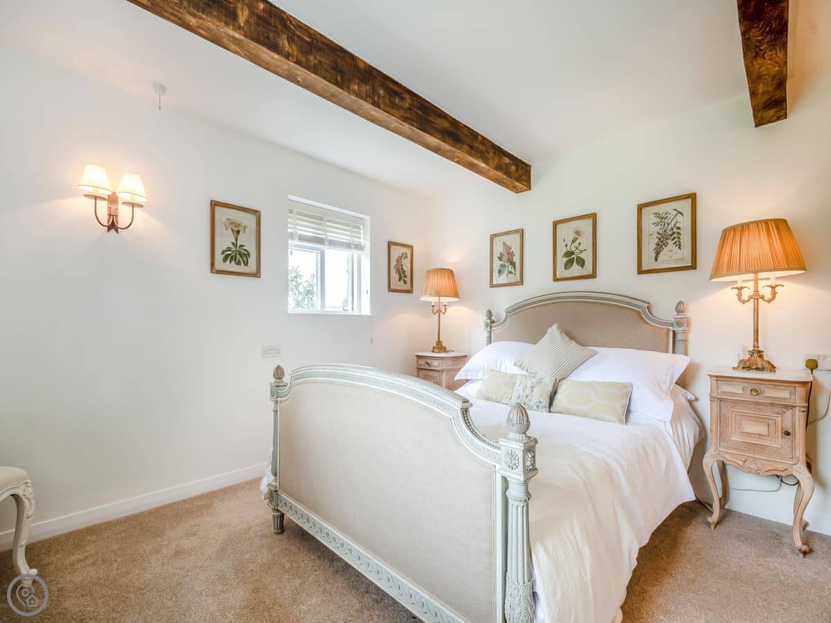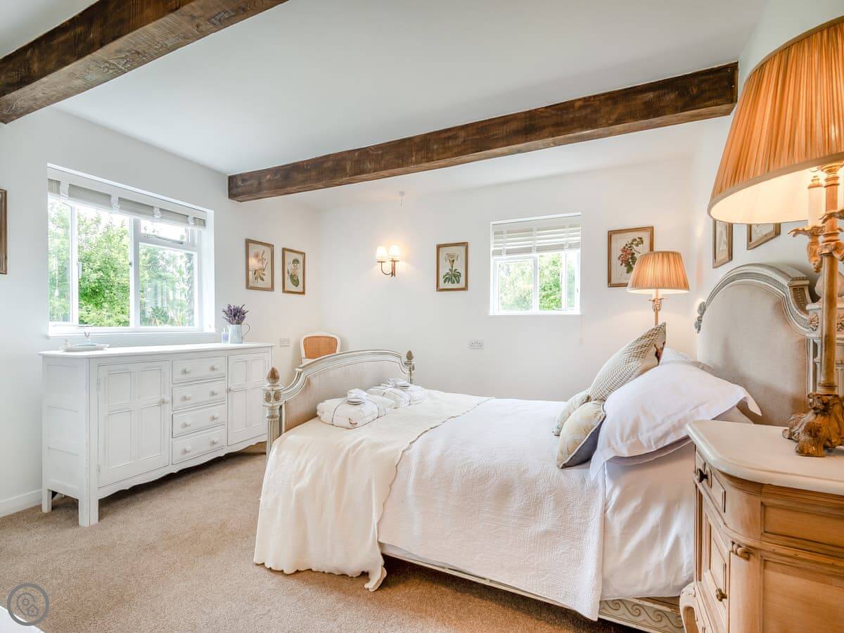 It's for two people. One bedroom with a kingsize bed, one bathroom with a walk-in shower. We can put a travel cot in the bedroom if you need one. You can bring one dog. They need to be on a lead in the garden, but there's five acres of our own woods and fields they can run about in.