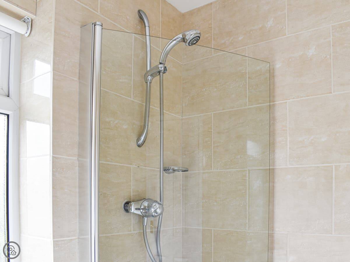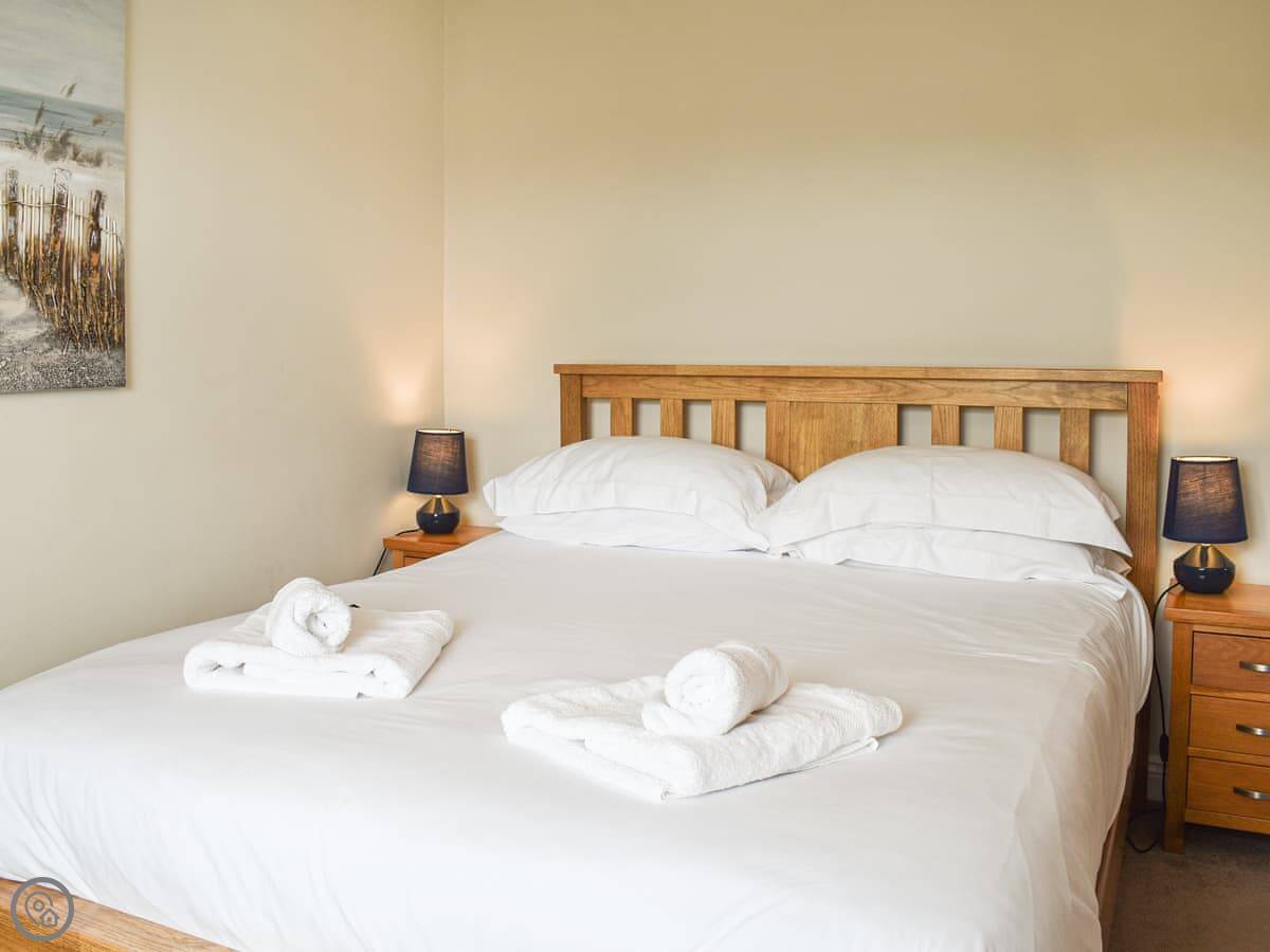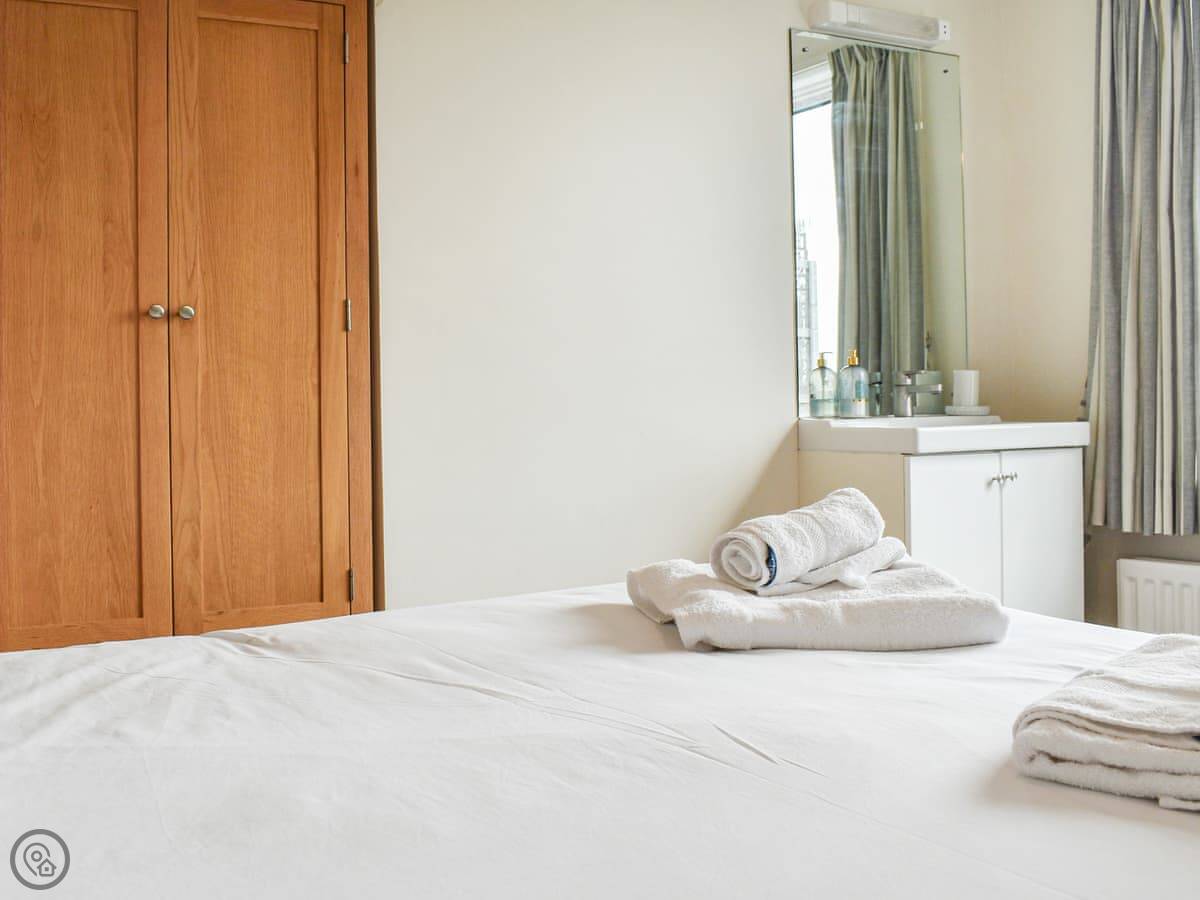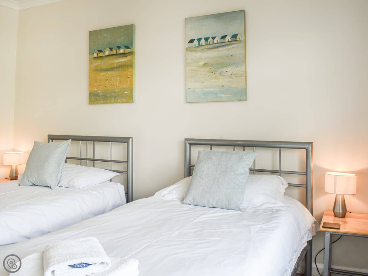 It sleeps four. Two bedrooms, one bathroom. One bedroom has a kingsize bed and a view. The other has twin beds with blackout curtains. The bathroom has a bath with a shower over it.