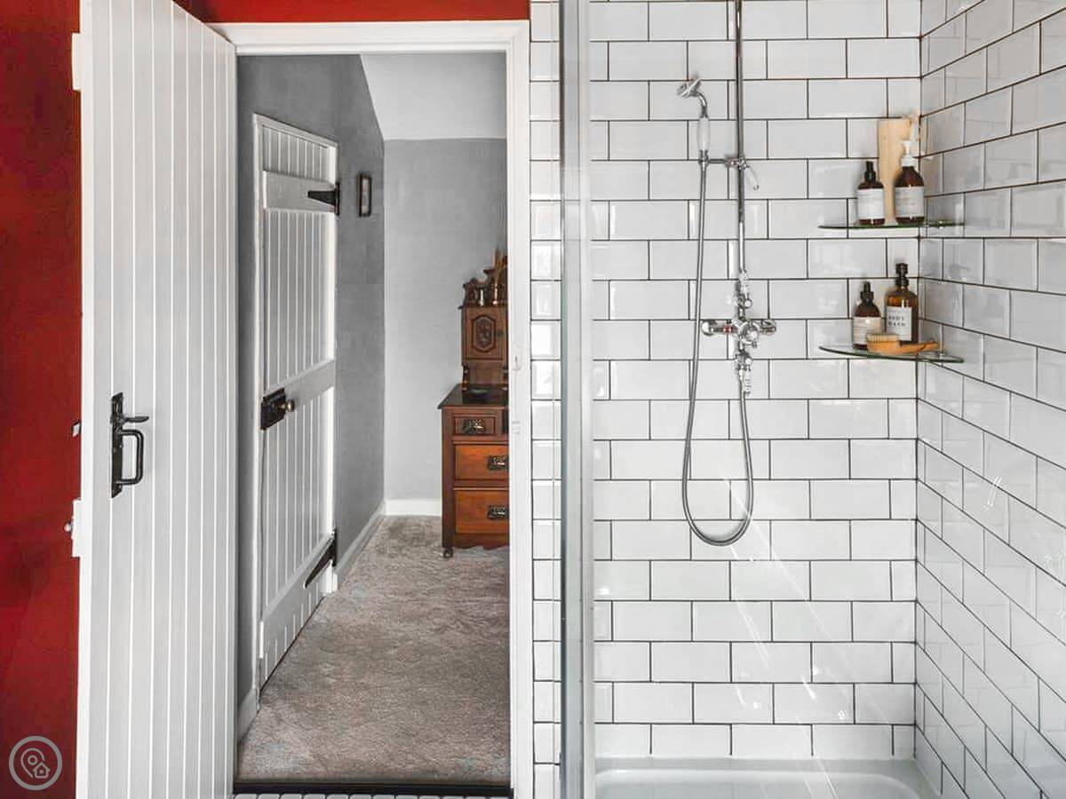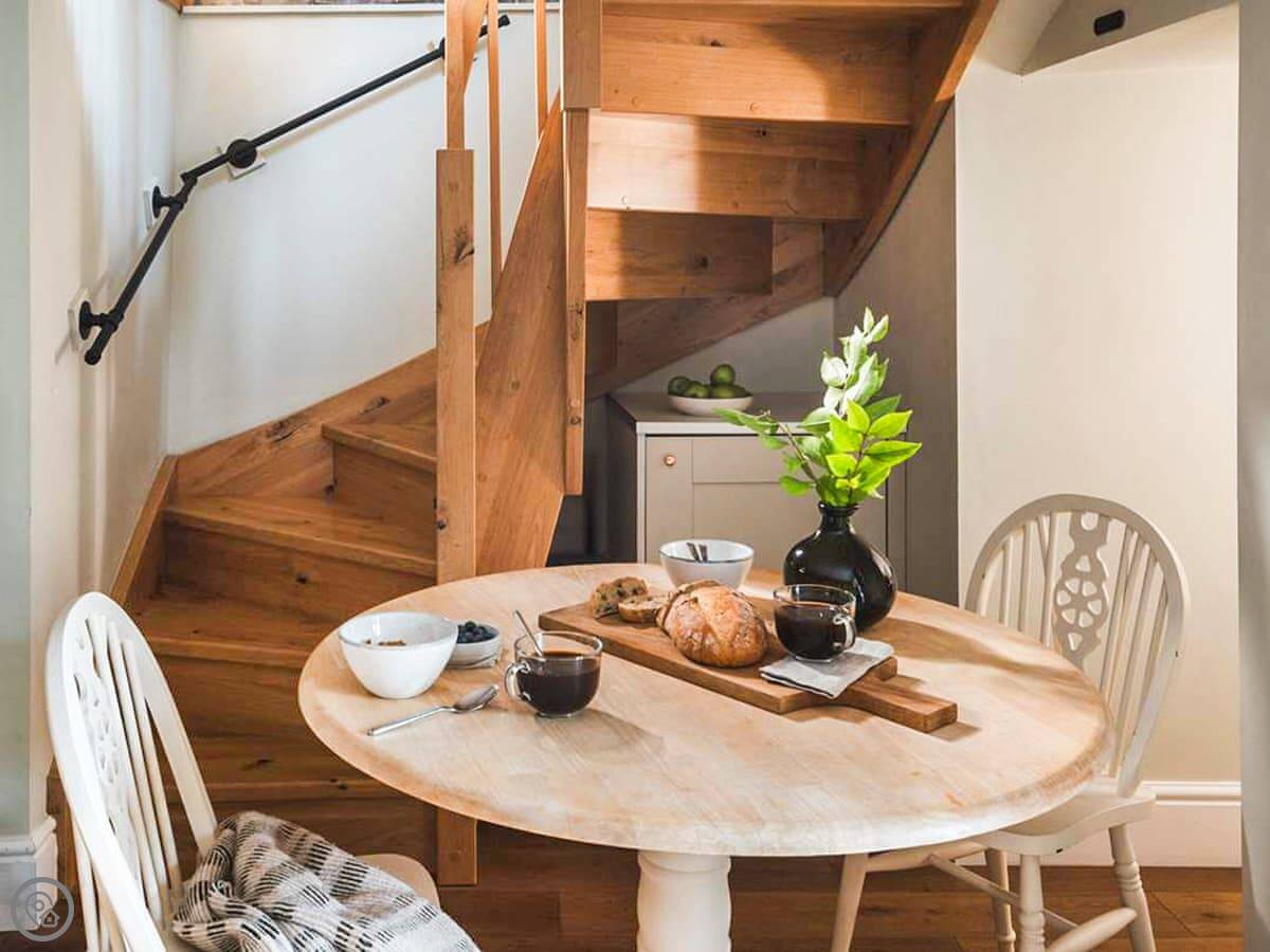 Inside, it's open plan downstairs. The bedroom has a super king bed. The shower is a proper walk-in one. There are original beams. The stairs to the bedroom are steep and they're open tread. Just so you know.