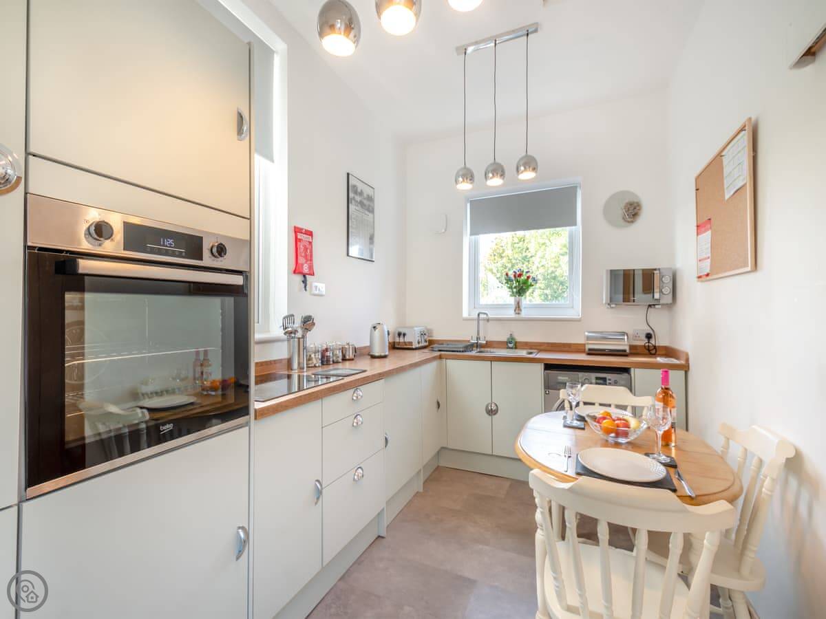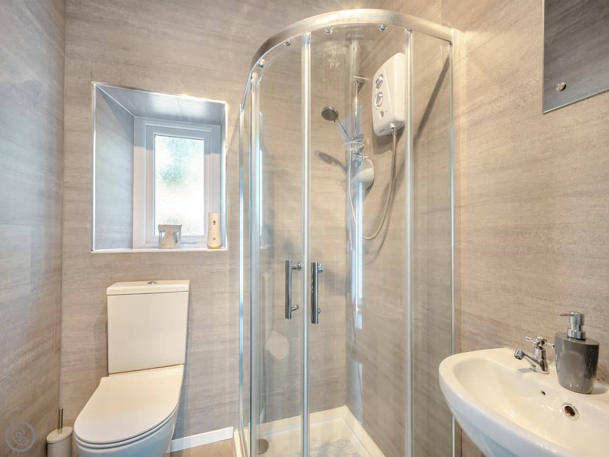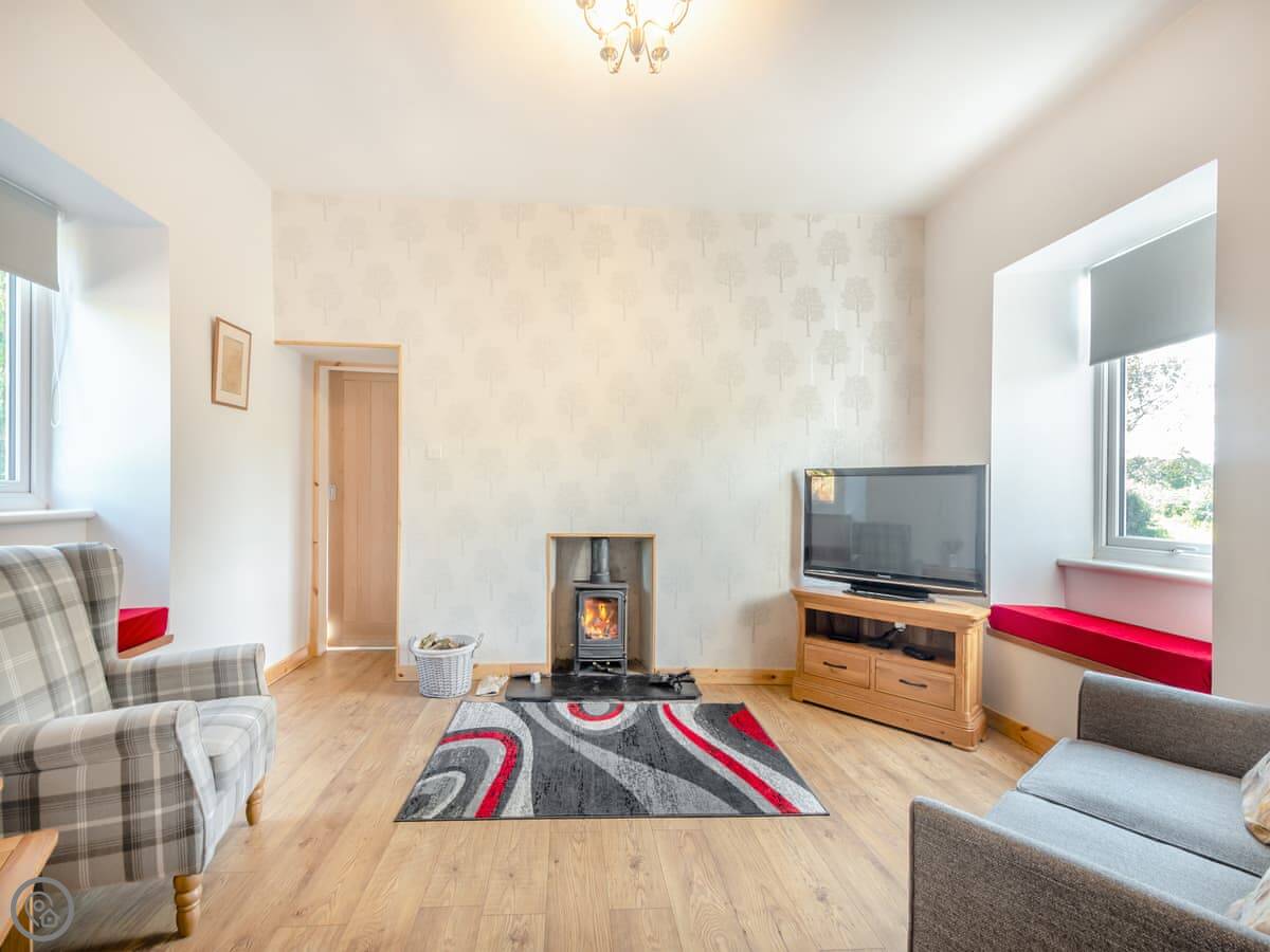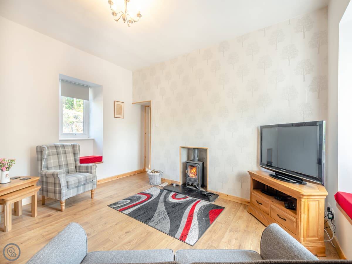 The living room has a wood burner. The kitchen's small but you can cook in it. It has a washing machine. The garden's at the back, and there's a summerhouse and a seating area up the slope. It's enclosed.