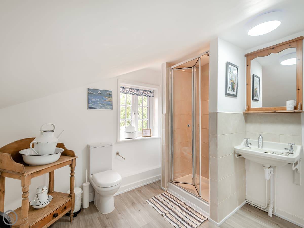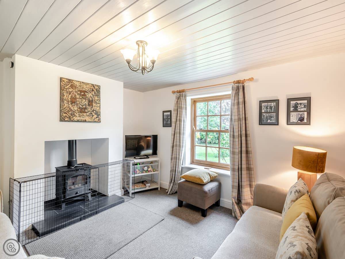 Downstairs there's a decent sized kitchen with a big table in it. There are two living rooms, both with TVs. One has a wood burner, which is nice when it's cold. Upstairs, the bedrooms are spacious. The stairs are a normal farmhouse staircase.