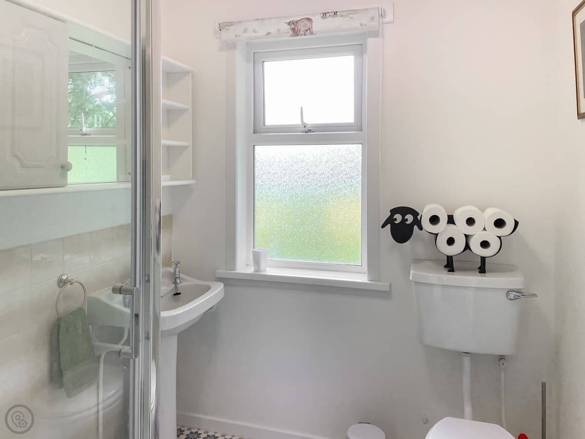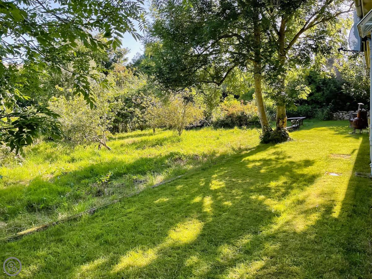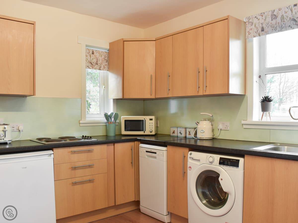 It sleeps six. Three bedrooms, one bathroom. It's got a 3 Star rating, so it's comfortable and clean but not posh. There's a woodburning stove for heat and a bit of atmosphere. The kitchen has a dishwasher and a washing machine. Bedding and towels are included. There's a garden area and parking right outside.