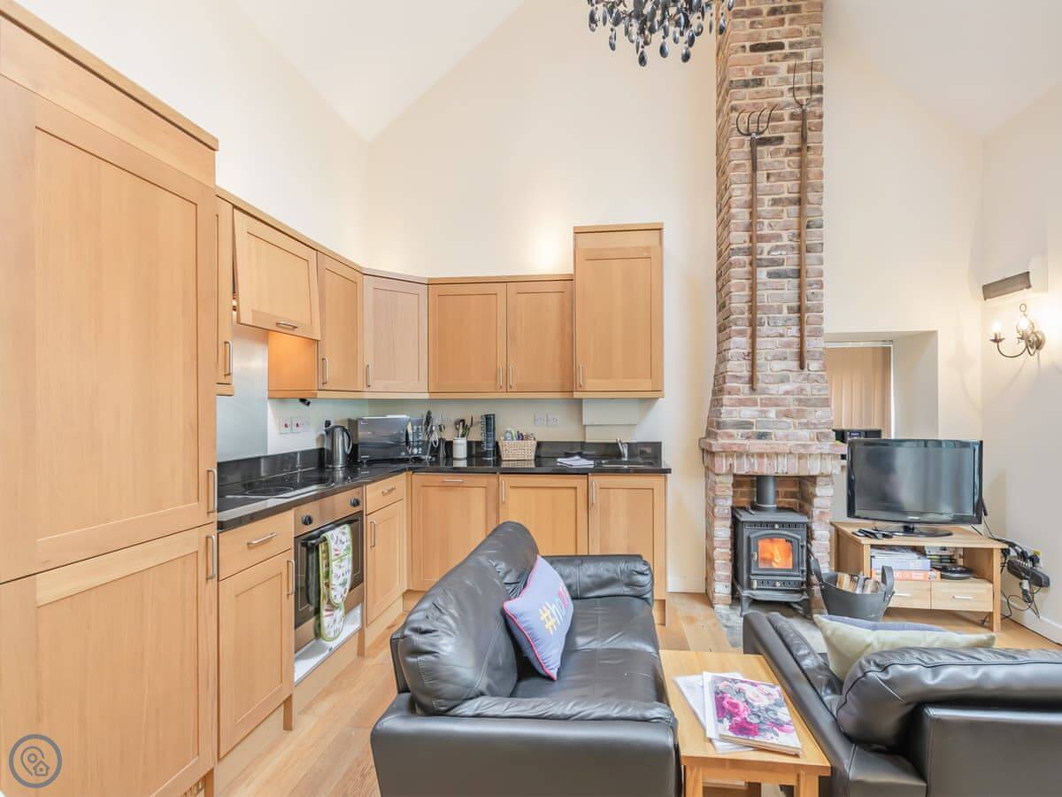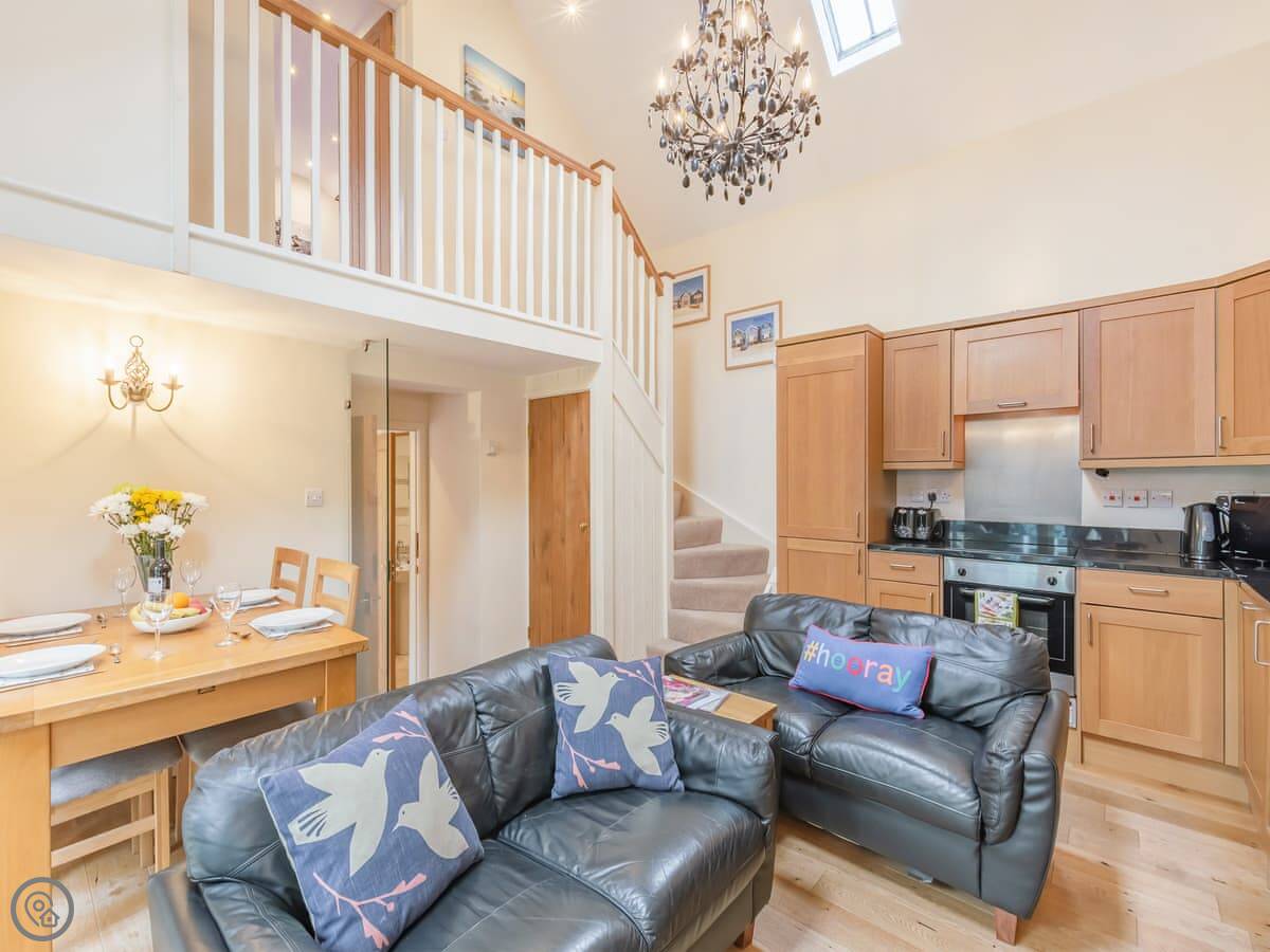 Inside, it's open plan downstairs with a wood burner. The kitchen has what you need. One bedroom is on the ground floor, just down a couple of steps. Its doors open onto the patio. The other is upstairs, accessed by a minstrel gallery. The stairs are fine, but the gallery has a low handrail, so watch your step.