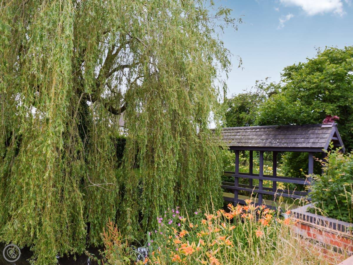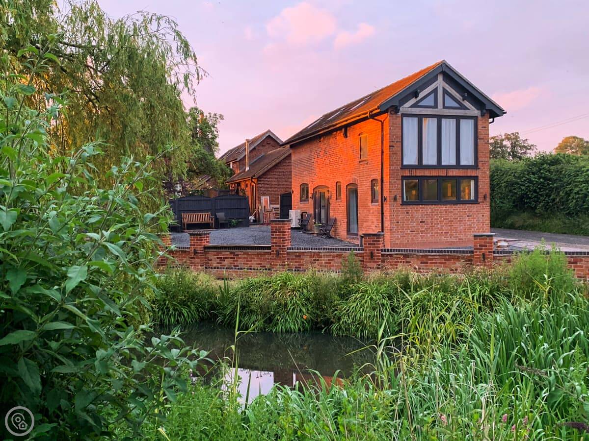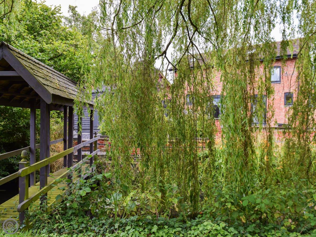 The Ash Loft is in Buerton, Cheshire. It's a detached place, so no one's attached to you. The garden is yours, with a lawn and a big pond out the front. There's a little bridge over the water to get to the door.