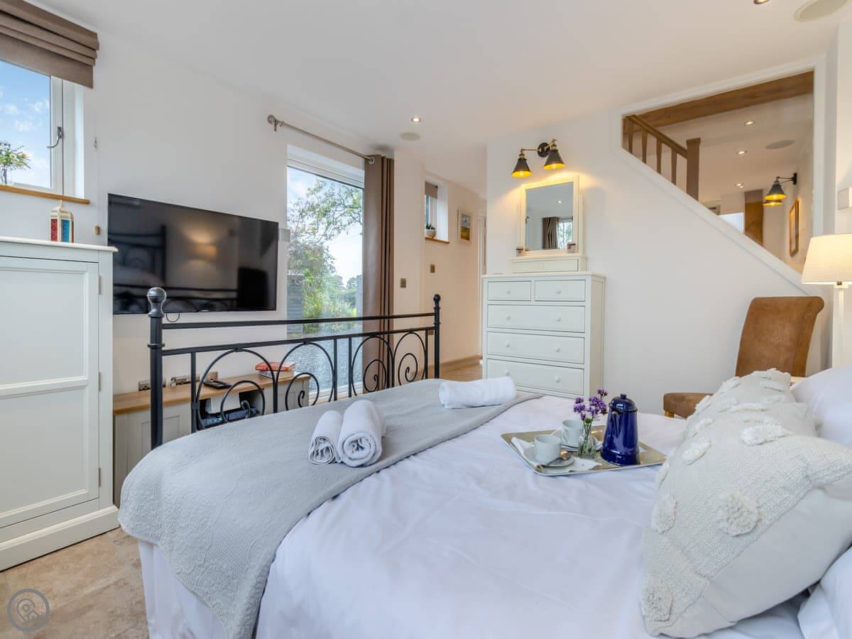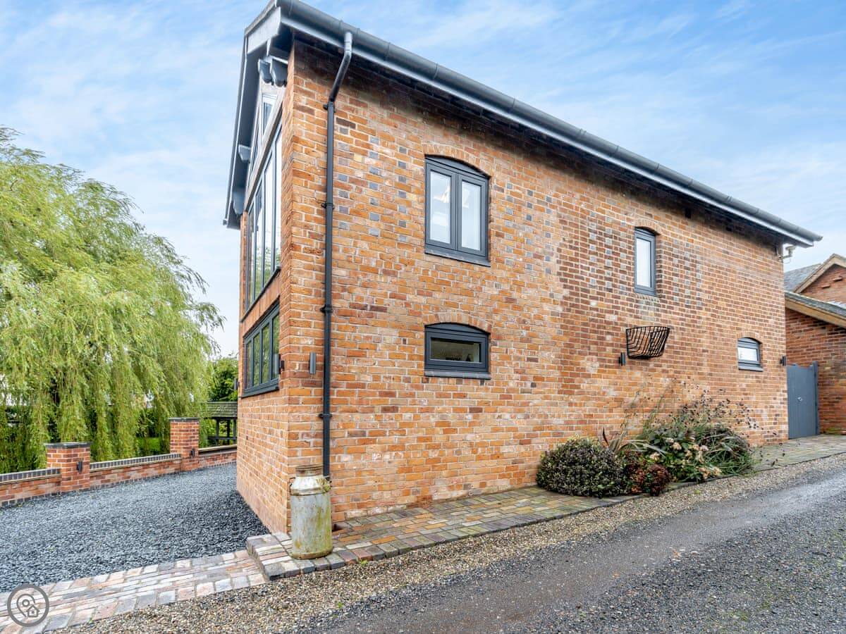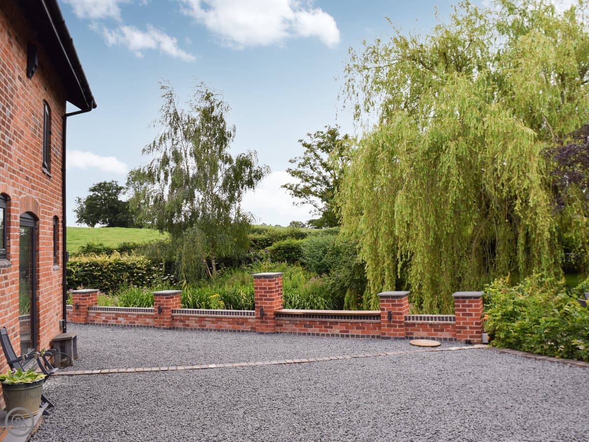 The Ash Loft is in Buerton, Cheshire. It's a detached place, so no one's attached to you. The garden is yours, with a lawn and a big pond out the front. There's a little bridge over the water to get to the door.