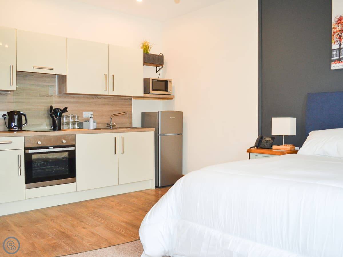 It's a ground floor apartment. It sleeps two people in the one room. It's got a 4 Star rating, which is good. It means it's well equipped and clean. The layout is all open plan, so the kitchen, living area and bed are all in the same space. It's a modern set up. The bathroom has a walk in shower.