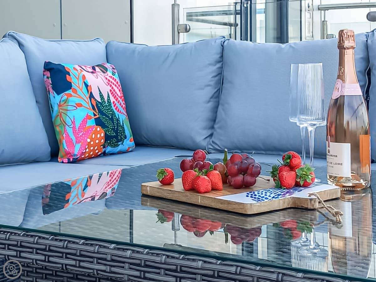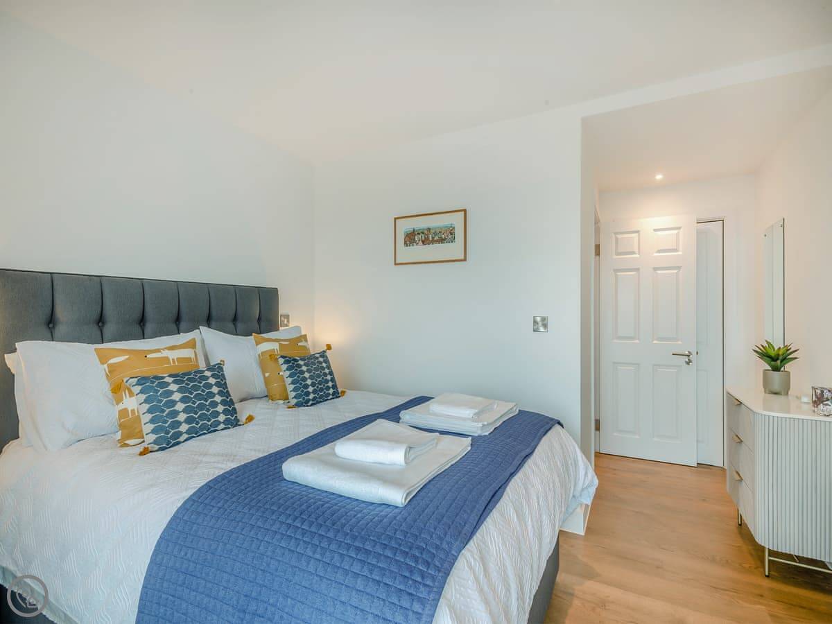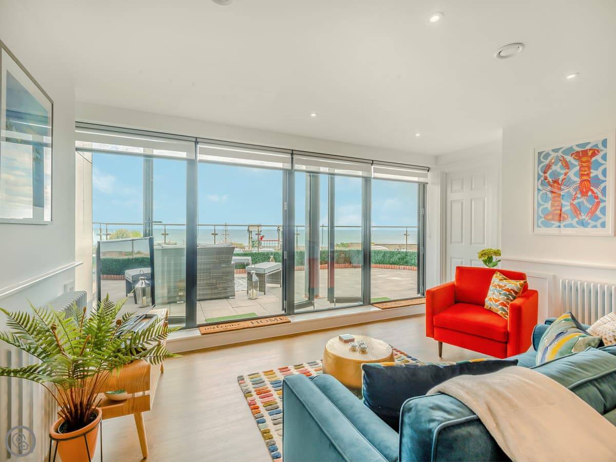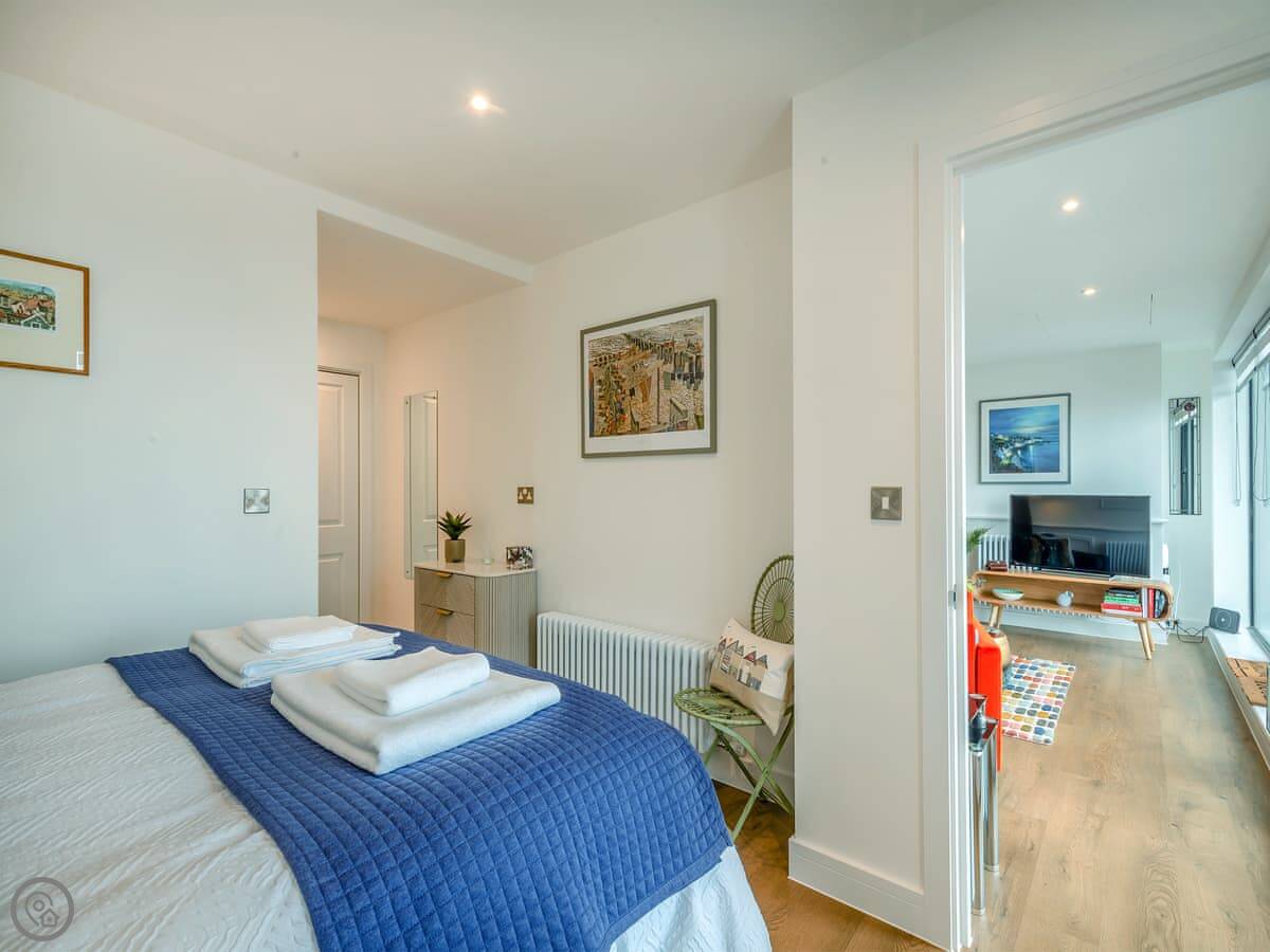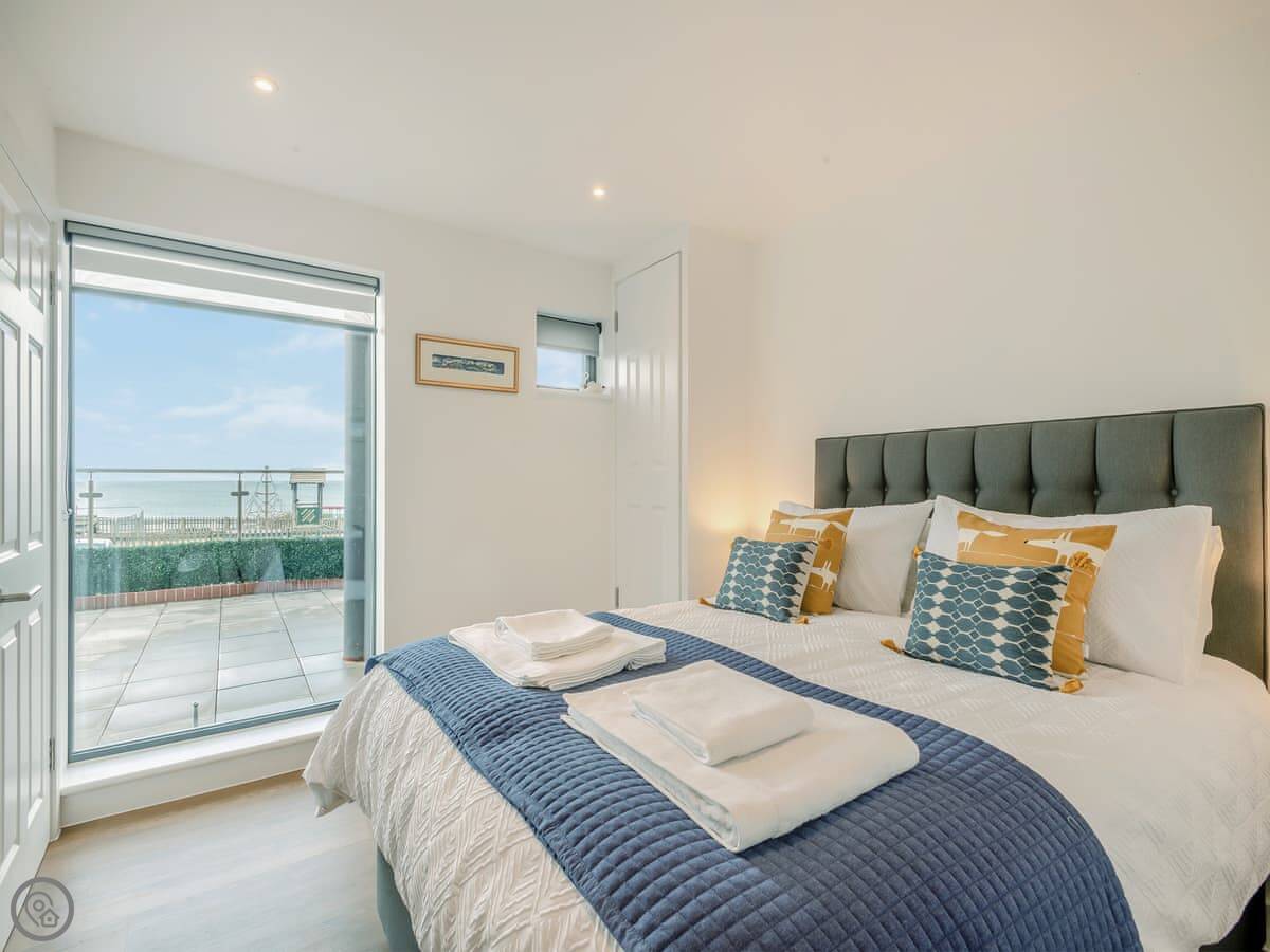 The key thing is the view. The whole front of the apartment is glass, so you see the sea from the main room. It’s a grown-up place that sleeps two. One bedroom with a king-size bed, one bathroom. It has a 5 Star rating. The owners use it themselves, so everything is good quality.