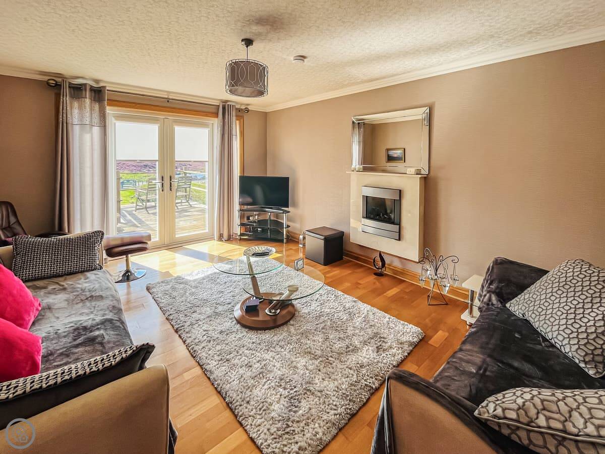 The house sleeps four, in two bedrooms. There's one bathroom. It has a 4 Star rating, which is good. It feels like a proper home, not just a holiday let. The main room is open plan. There's also a conservatory on the back, which is nice when it's sunny but not warm enough to be outside. The decking outside is big, with views over the croft land.