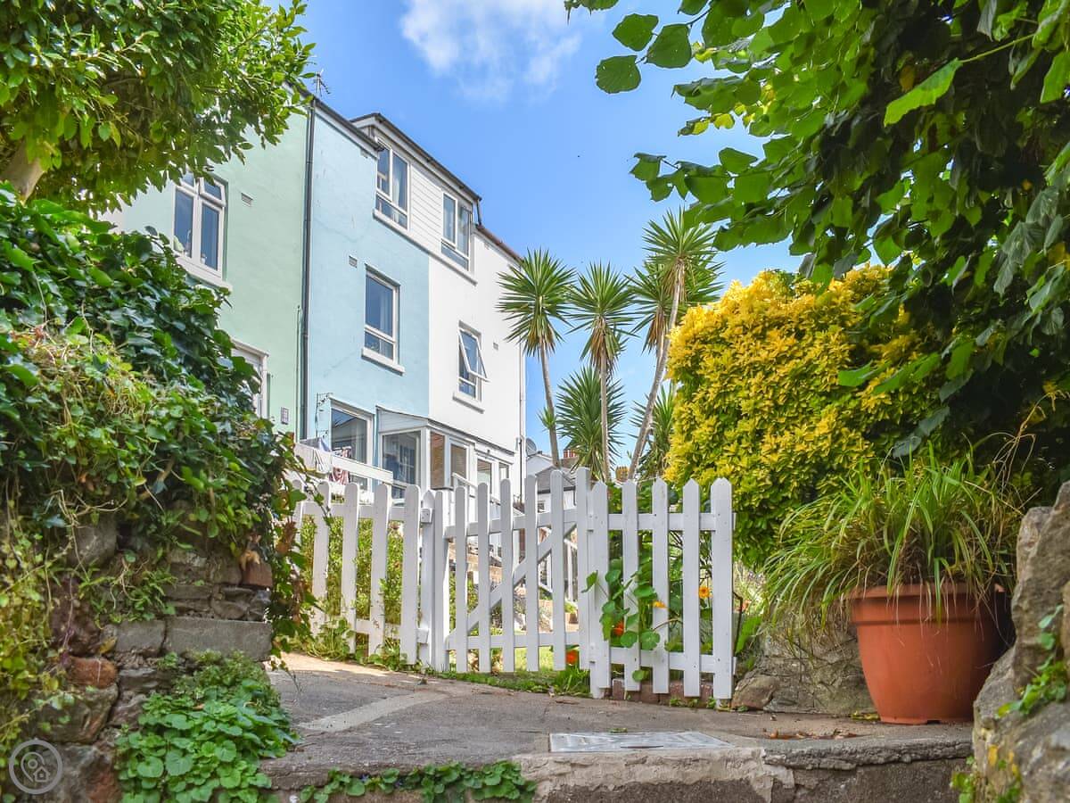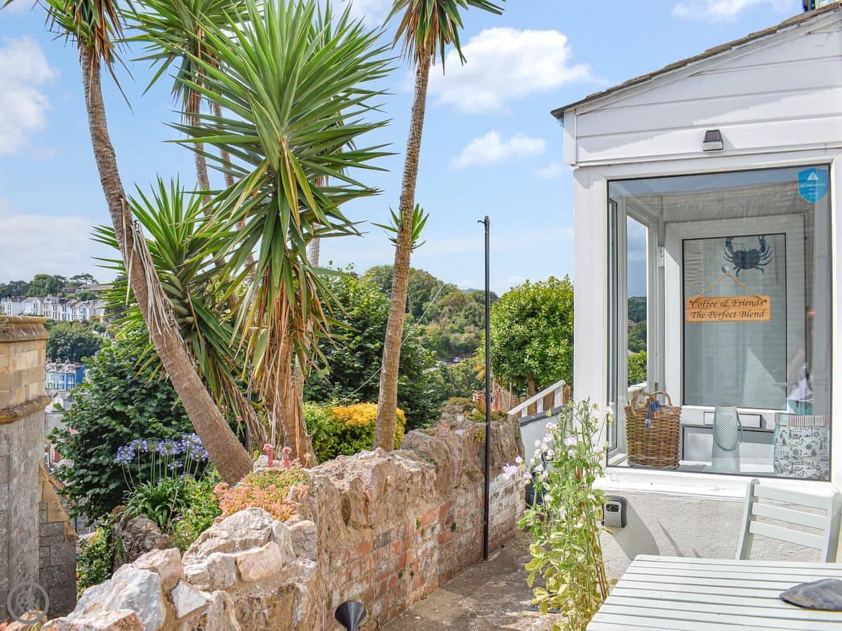 The garden is on a slope. The view looks over the rooftops to the sea.