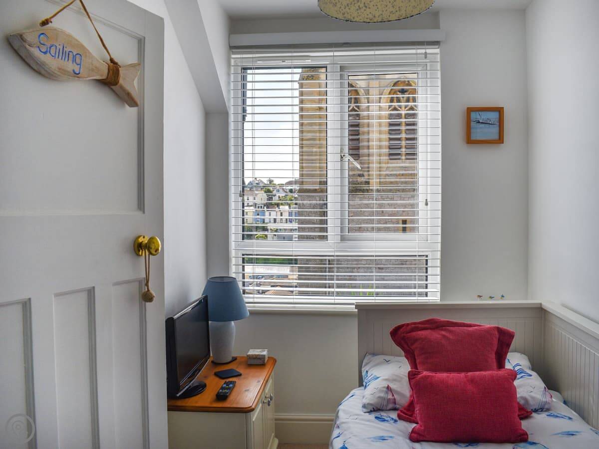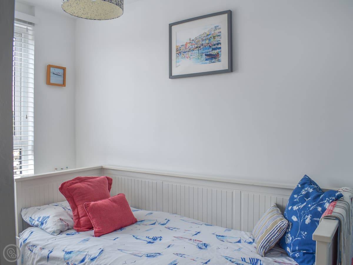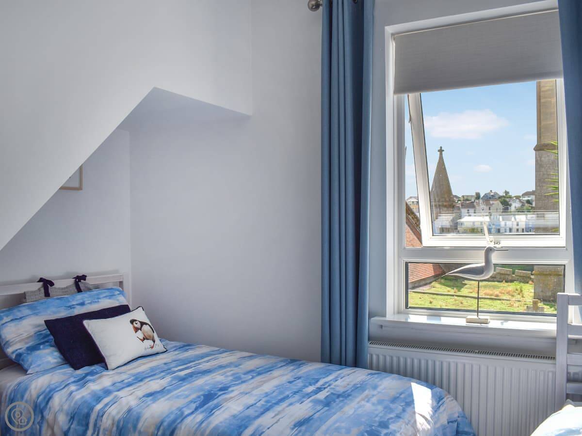 The living room looks over the garden and the church. The kitchen has what you need. There's a small bistro table outside. Upstairs, the twin bedroom is at the front. The bathroom has a walk-in shower. Up another flight is the double bedroom and a separate games room with a daybed and a TV.