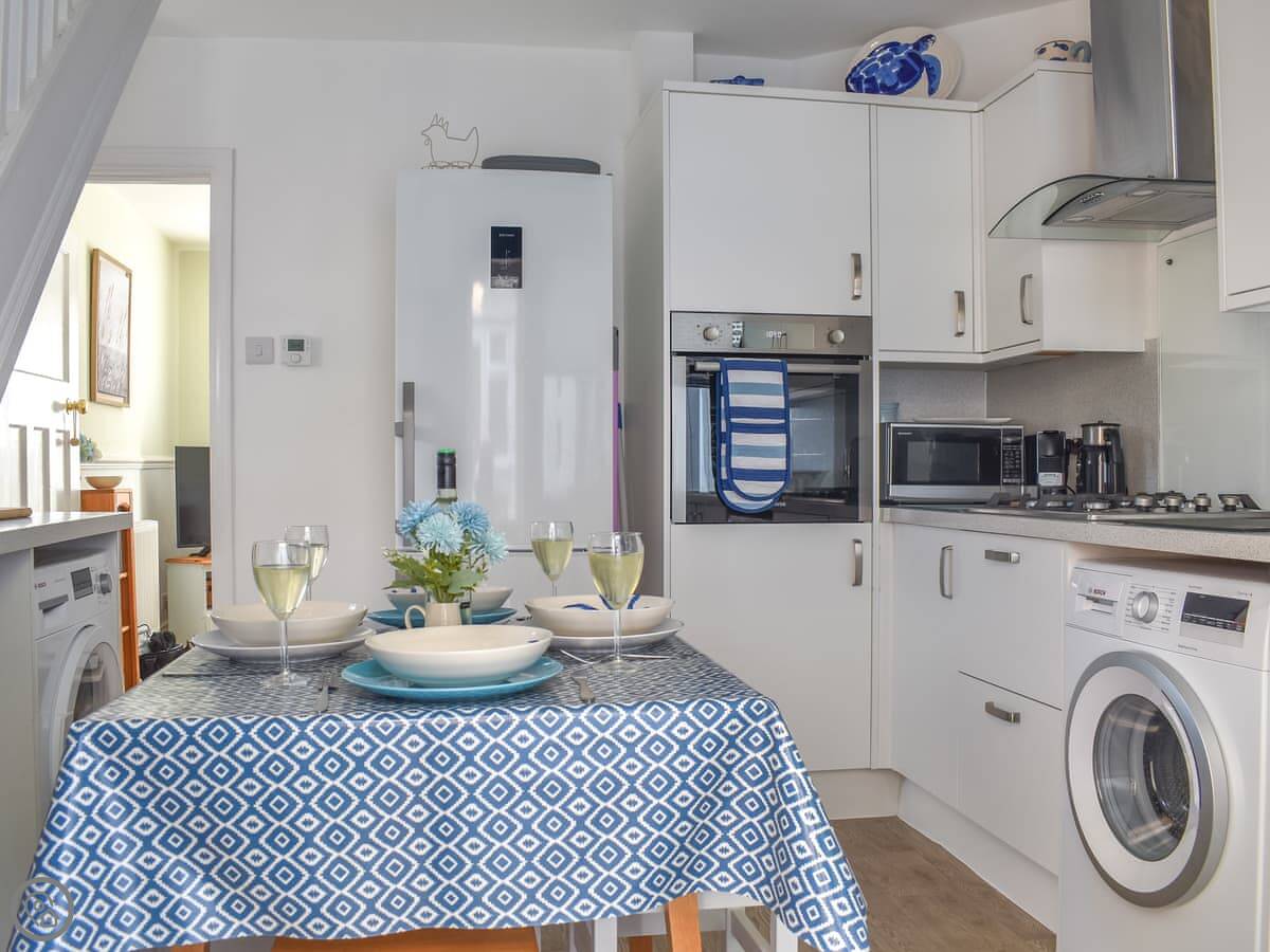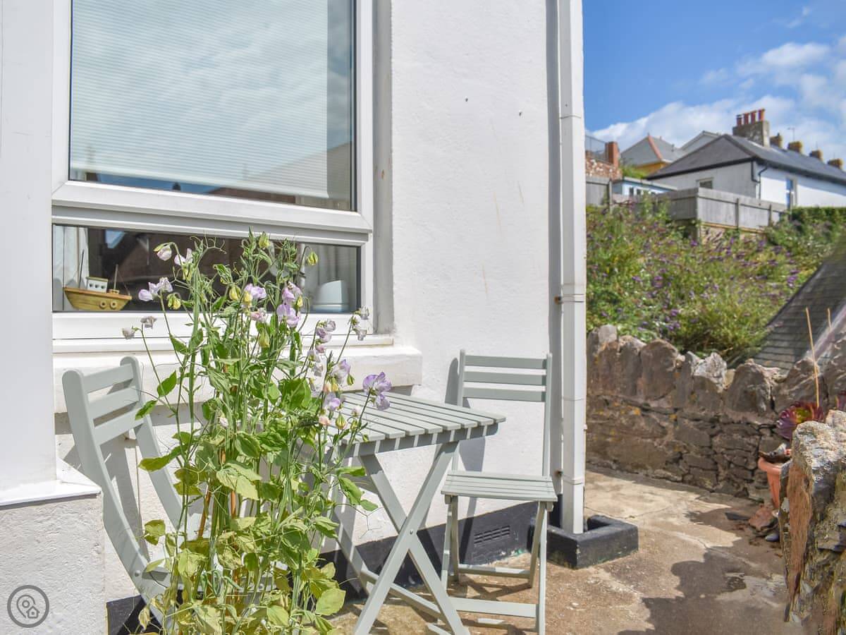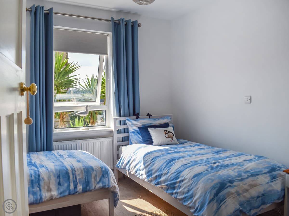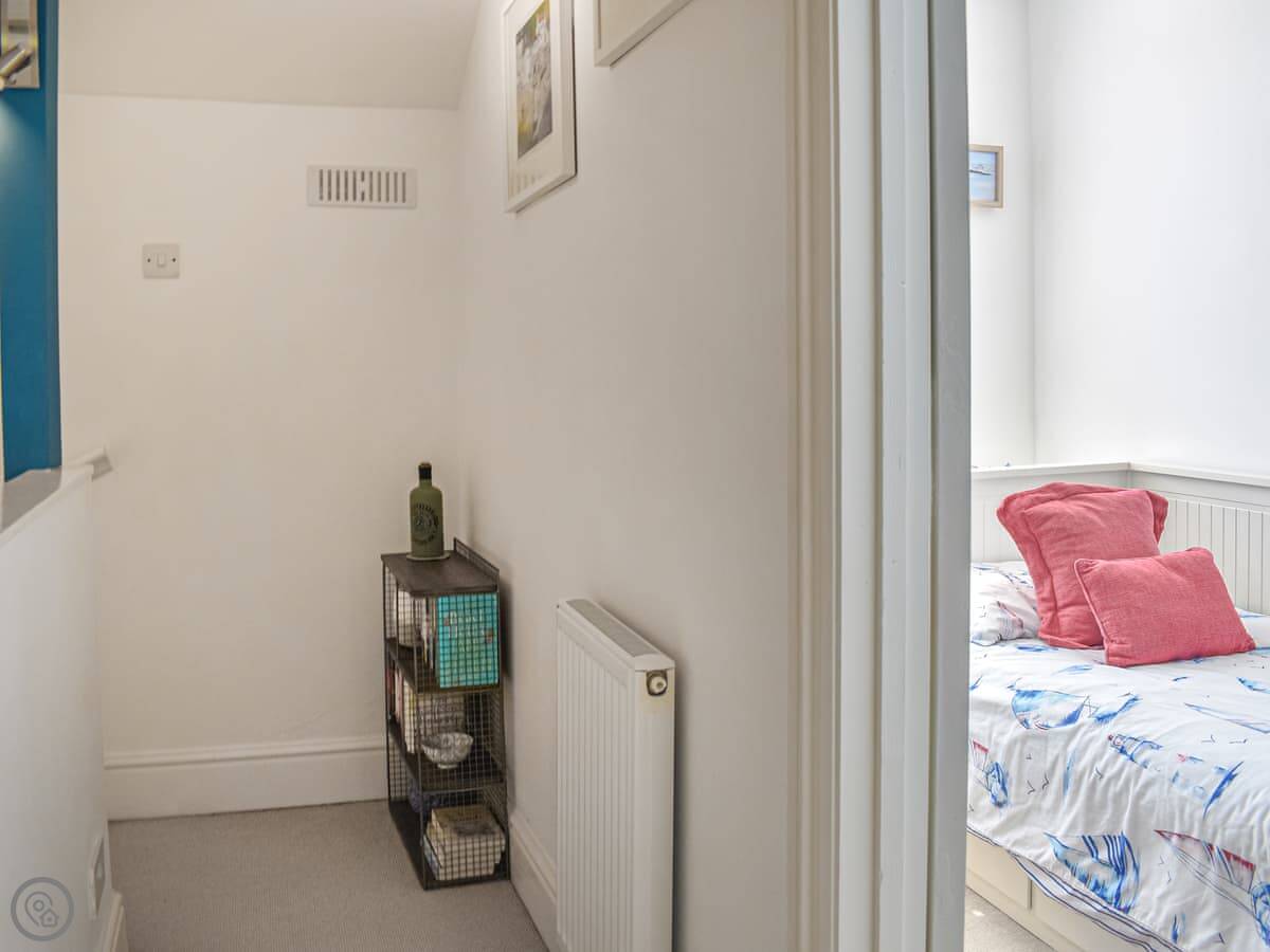 The living room looks over the garden and the church. The kitchen has what you need. There's a small bistro table outside. Upstairs, the twin bedroom is at the front. The bathroom has a walk-in shower. Up another flight is the double bedroom and a separate games room with a daybed and a TV.