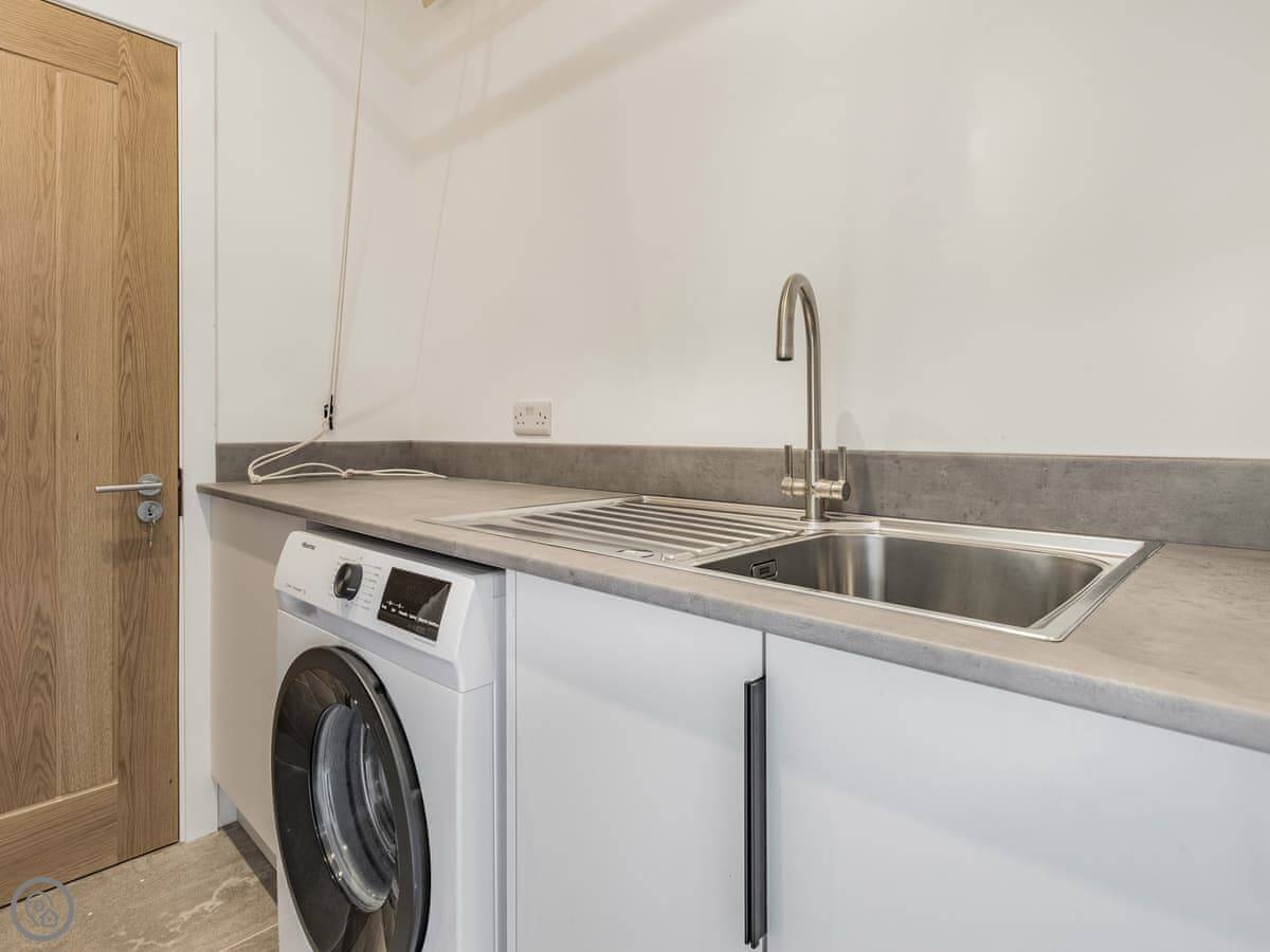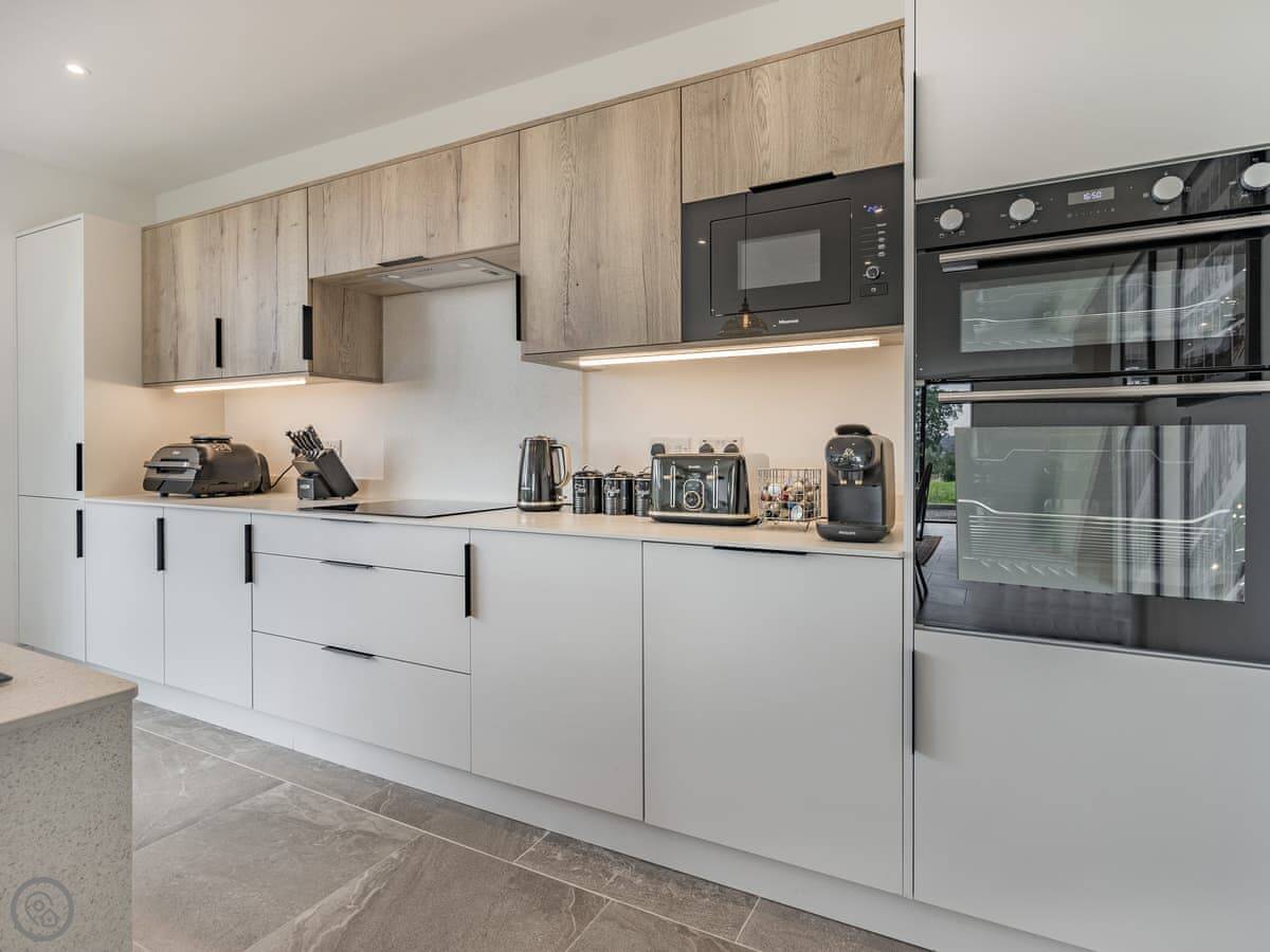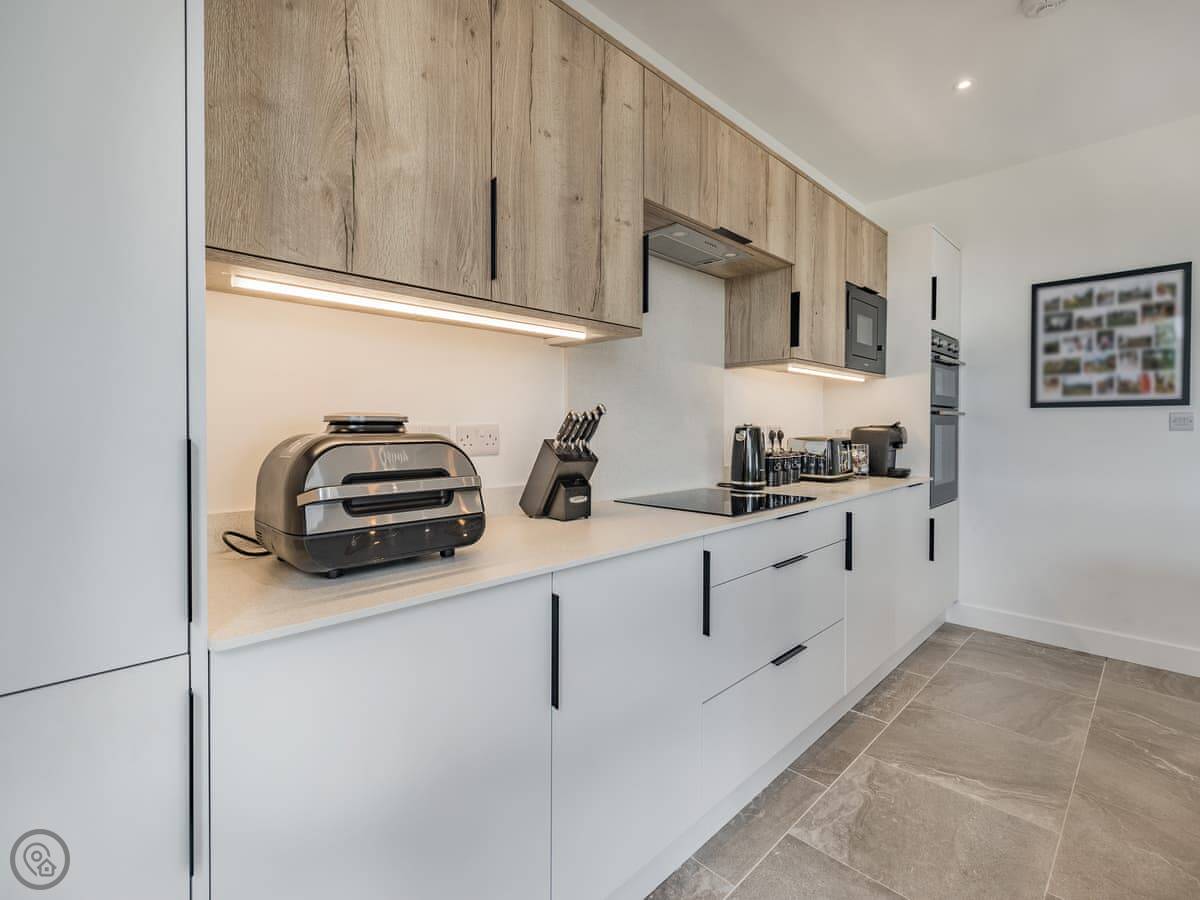 You come in to one big open room. The kitchen's at one end with an island. It's got a dishwasher, washing machine, an air fryer and a coffee machine. The living area is at the other end with a wood burner. We leave some wood for you to start with. Sliding doors open onto the garden.