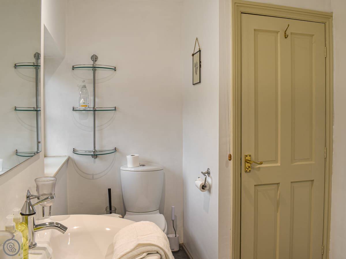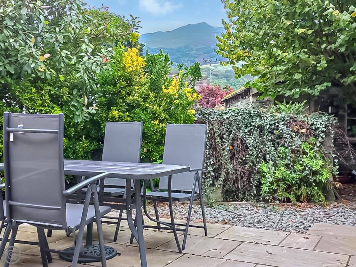 The living room is downstairs, with a wood burner. The kitchen leads out to a walled patio at the back. It gets the sun in the afternoon. There's a good view of Wansfell from there. There's also a stone shed out back for bikes or walking gear.
