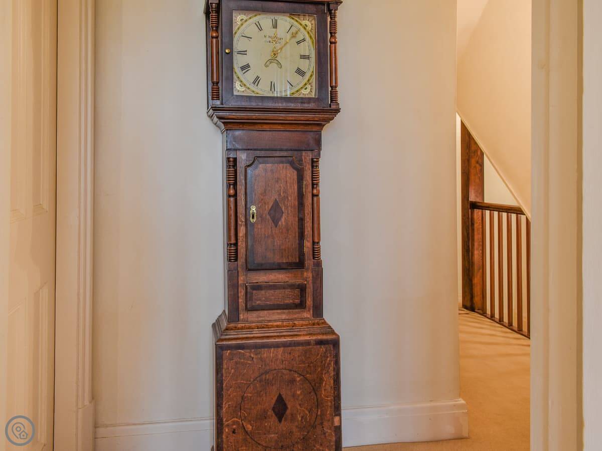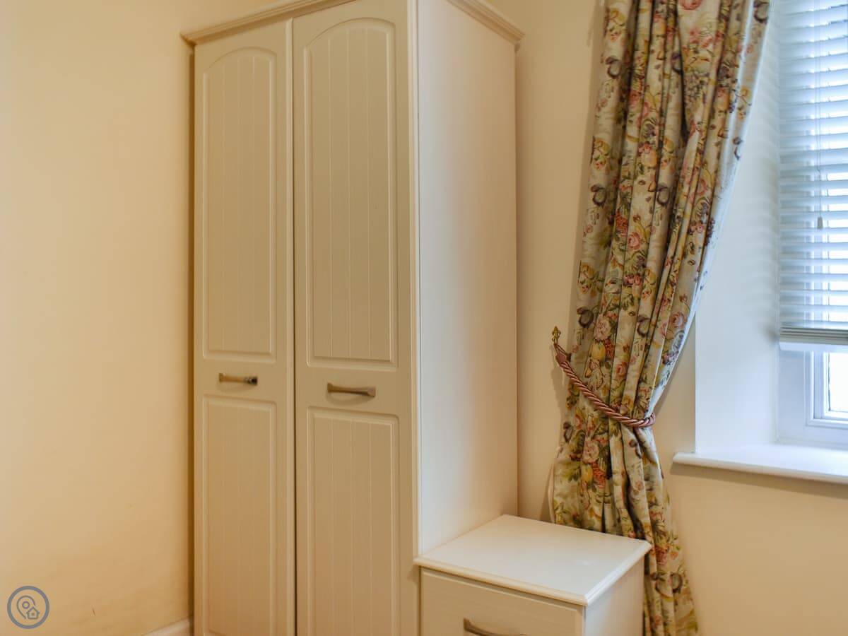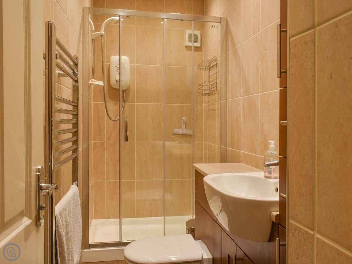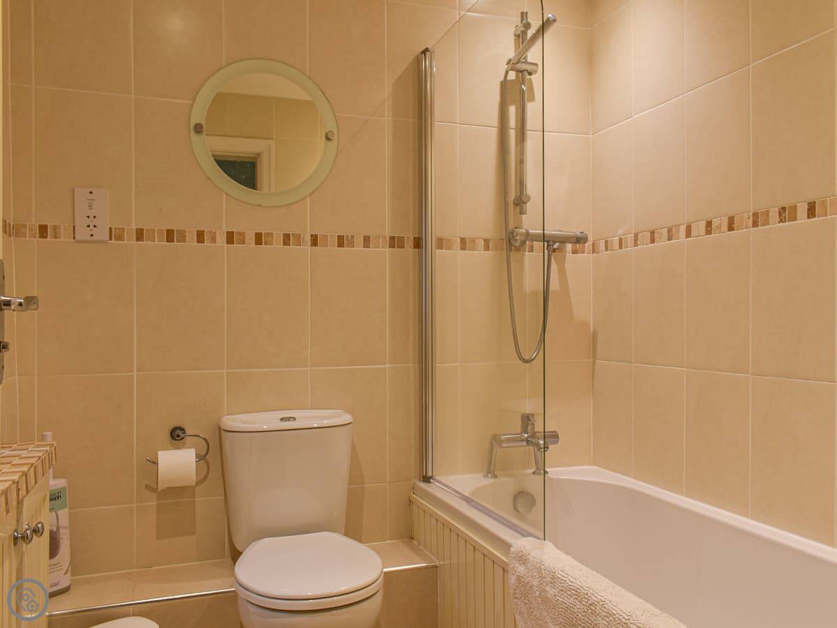 It sleeps four, in two double bedrooms. One bed can be split into two singles if you need that. There are two bathrooms, one upstairs with a bath, and one downstairs with a walk-in shower. The stairs down to that shower are a bit steep, just so you know.