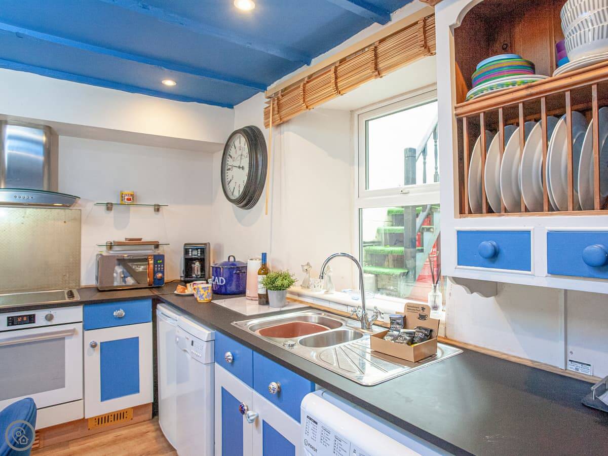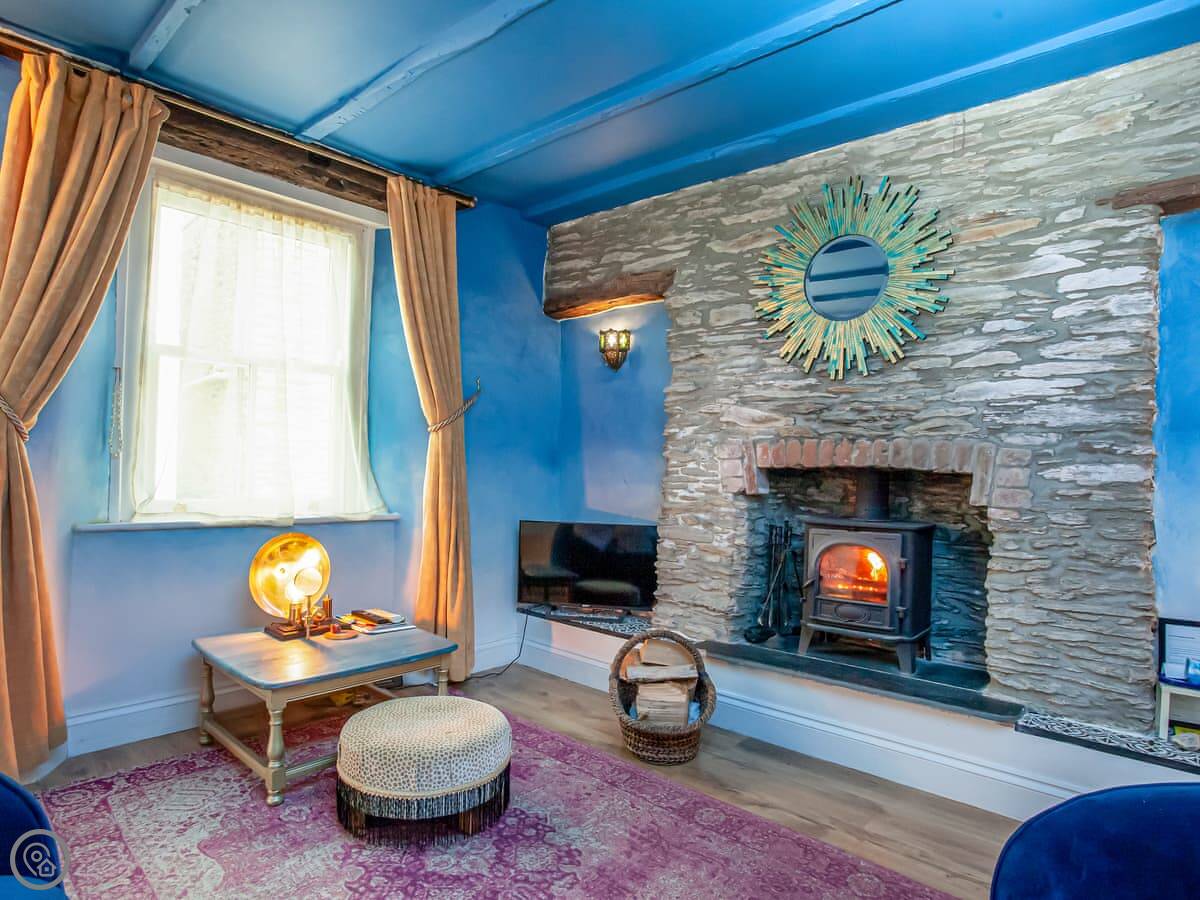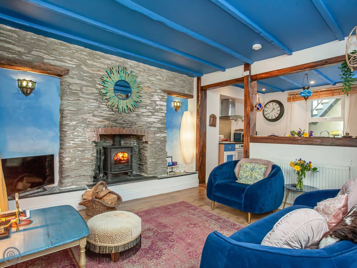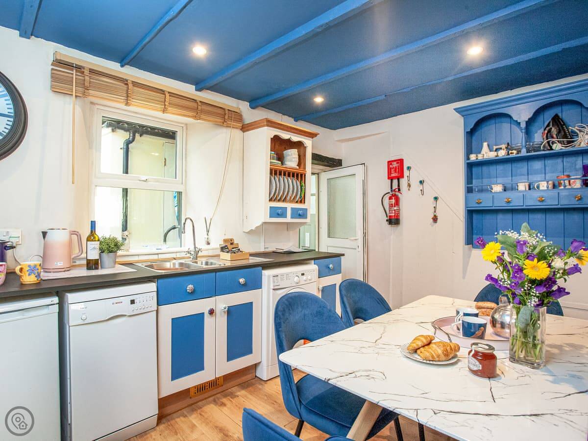 The living room has a wood burner. We leave some logs to get you started. There's a TV and WiFi. The kitchen has a dishwasher and washing machine. There's a raised deck out the back with a table and chairs.