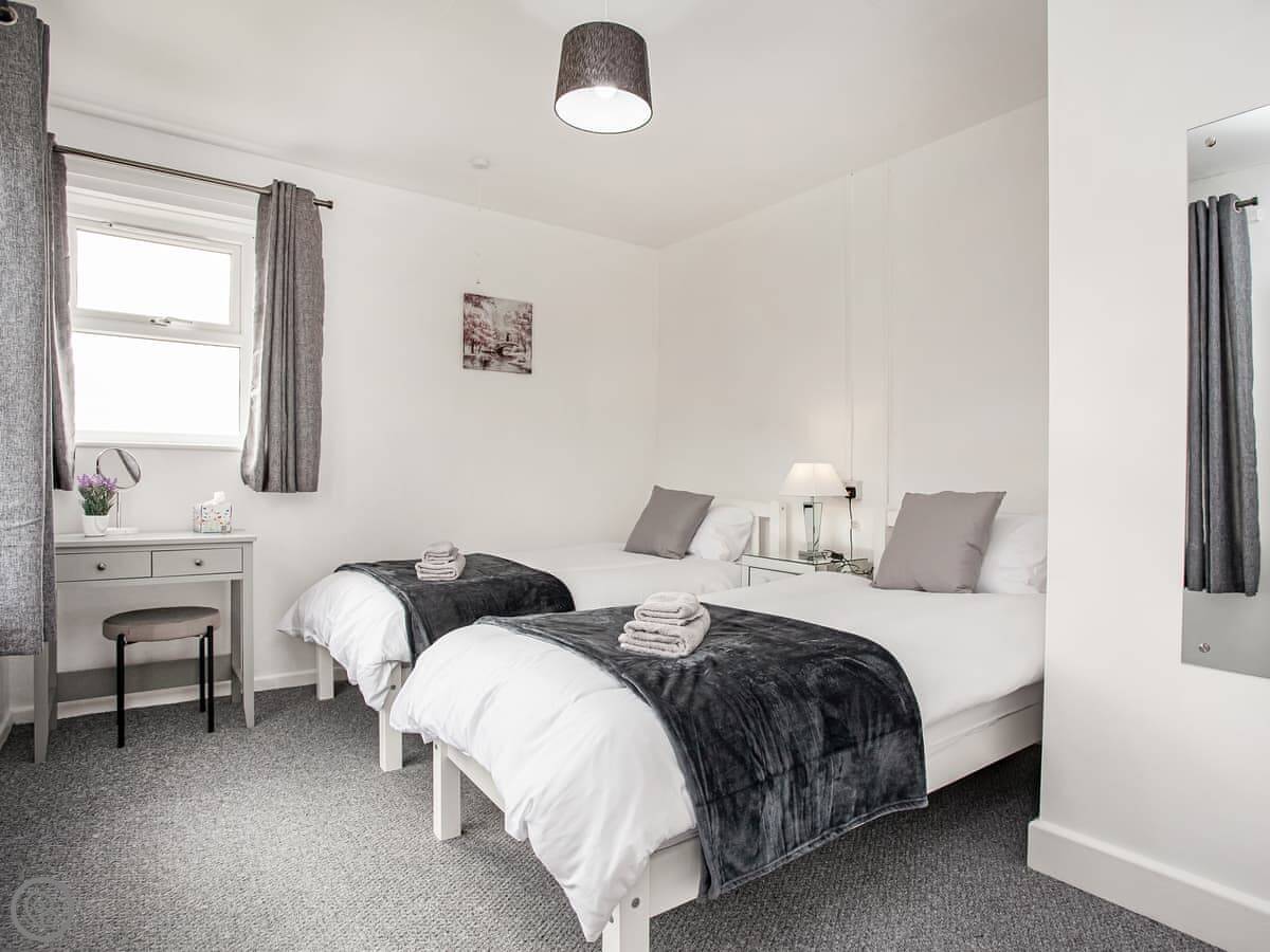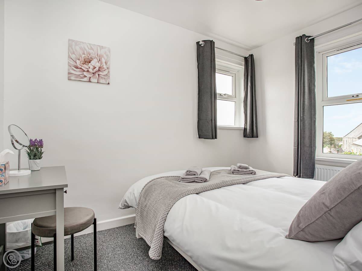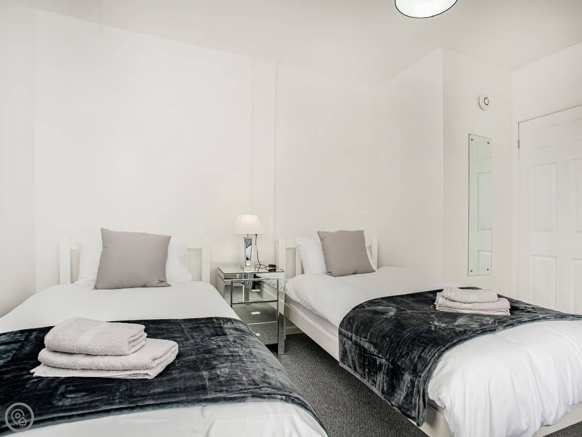 It sleeps four in two bedrooms. One has a double bed, the other has two singles. There's one bathroom with a walk-in shower. It's a 3 Star place, so it's comfortable and clean but not luxurious. Everything works.