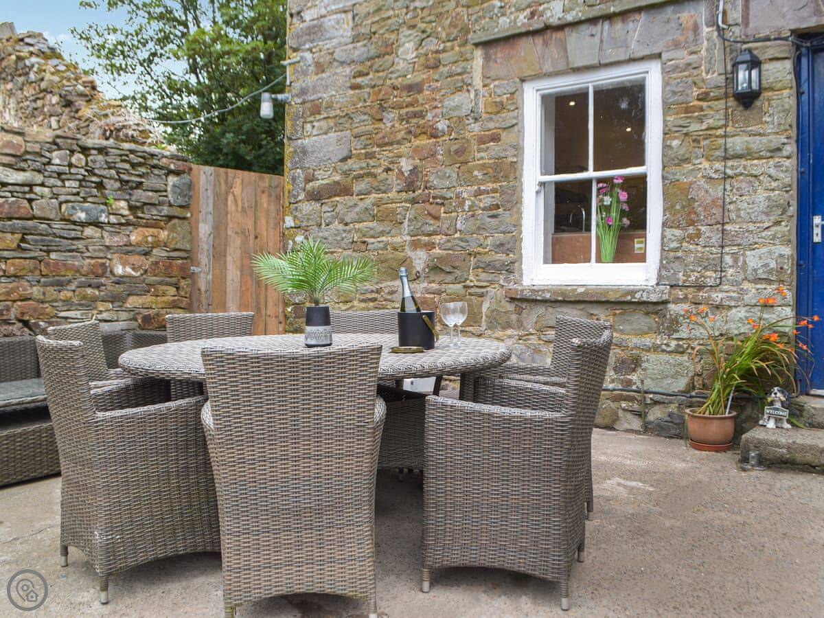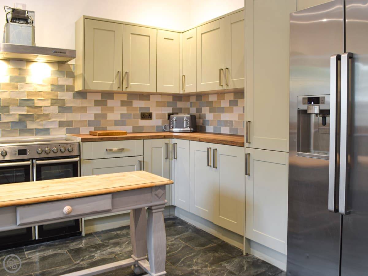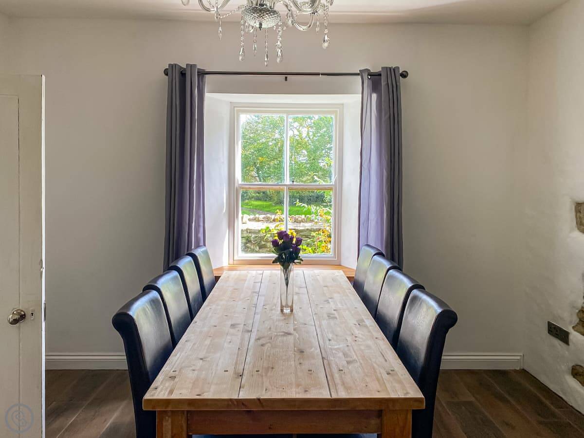The garden is lawned with a patio. There's a BBQ. Inside, the main living room has an open fire. The kitchen is big enough for a group, and there's a large dining table.