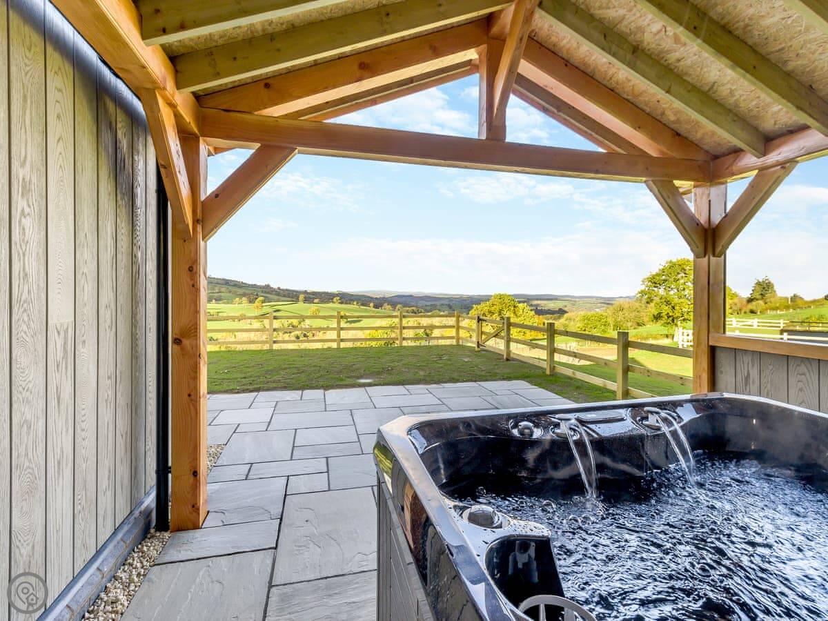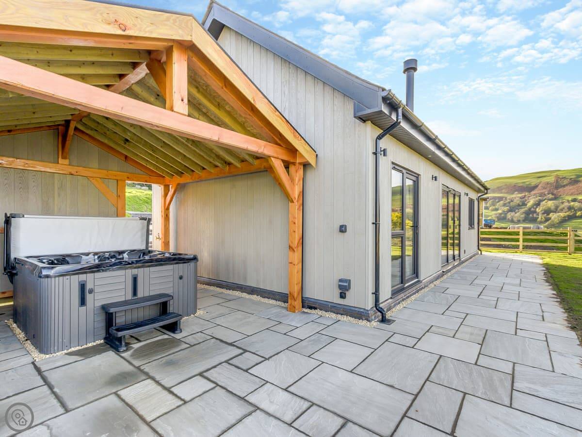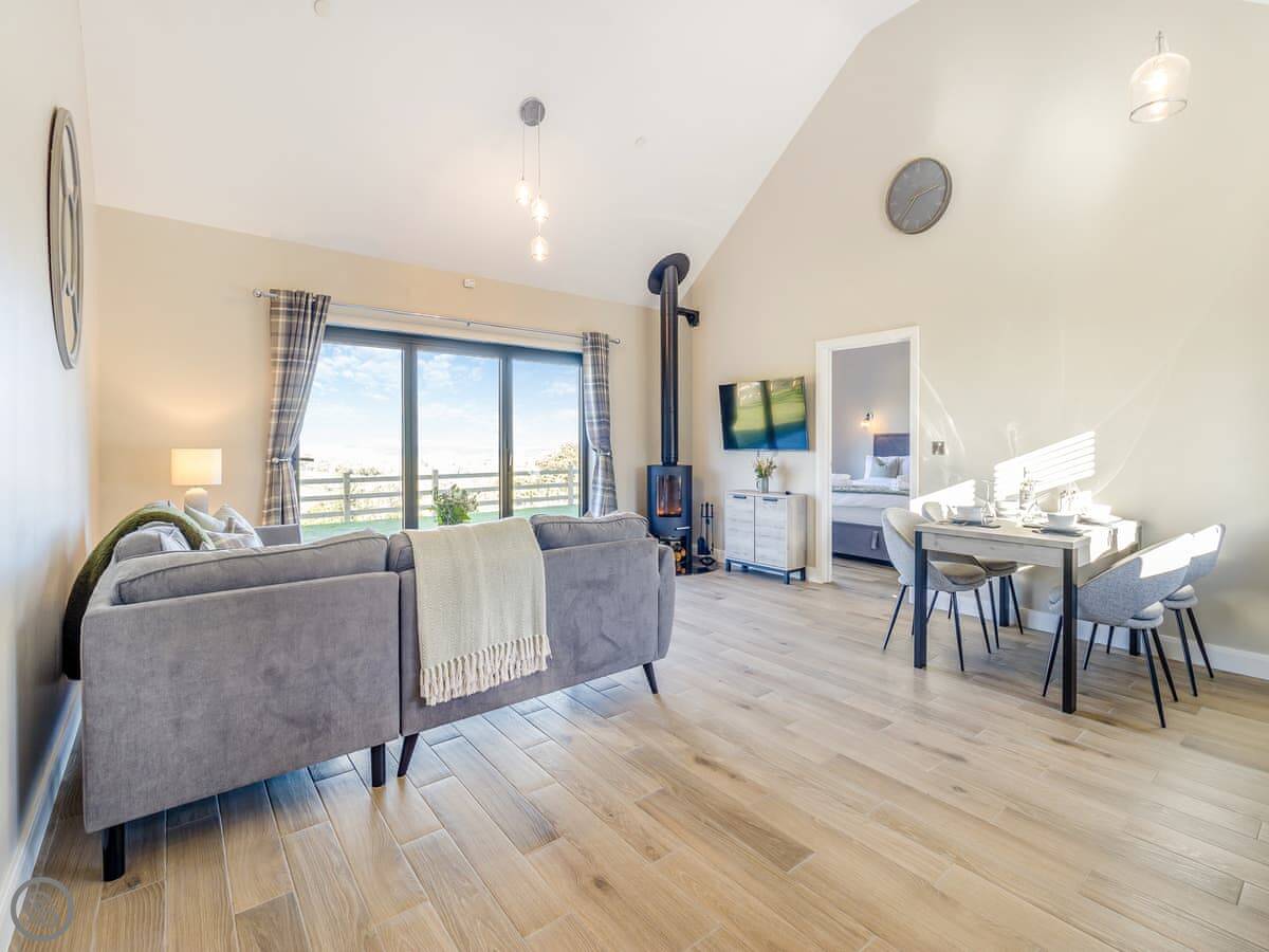The main room is open plan, with the kitchen, a dining table, and the sitting area all together. There's a wood burner for cooler nights and patio doors that open straight onto your deck. The deck has a covered hot tub, so you can use it in any weather.