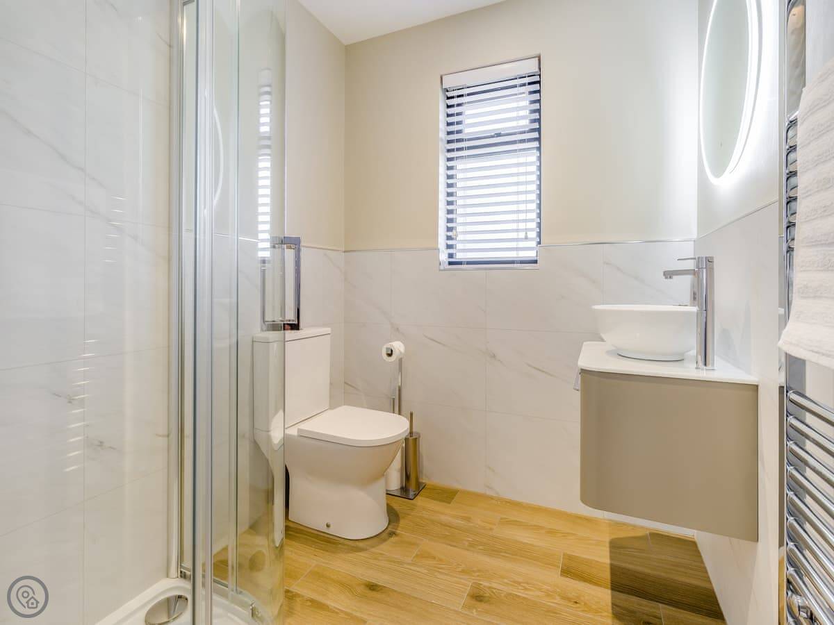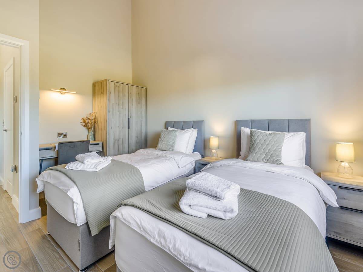 It sleeps four. Two bedrooms, both with their own shower rooms. One bedroom has a big bed and an en-suite wet room. The other has two singles that can be zipped together into one big bed if you ask beforehand. It's all on one level.