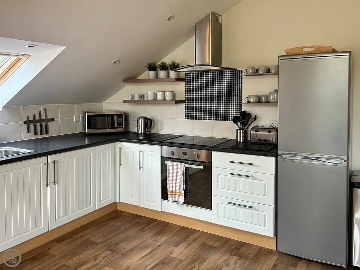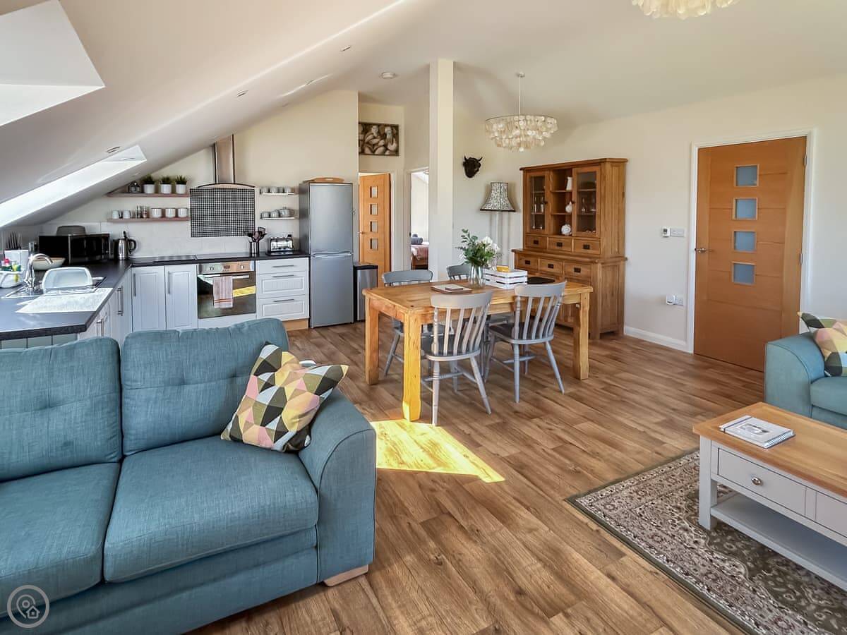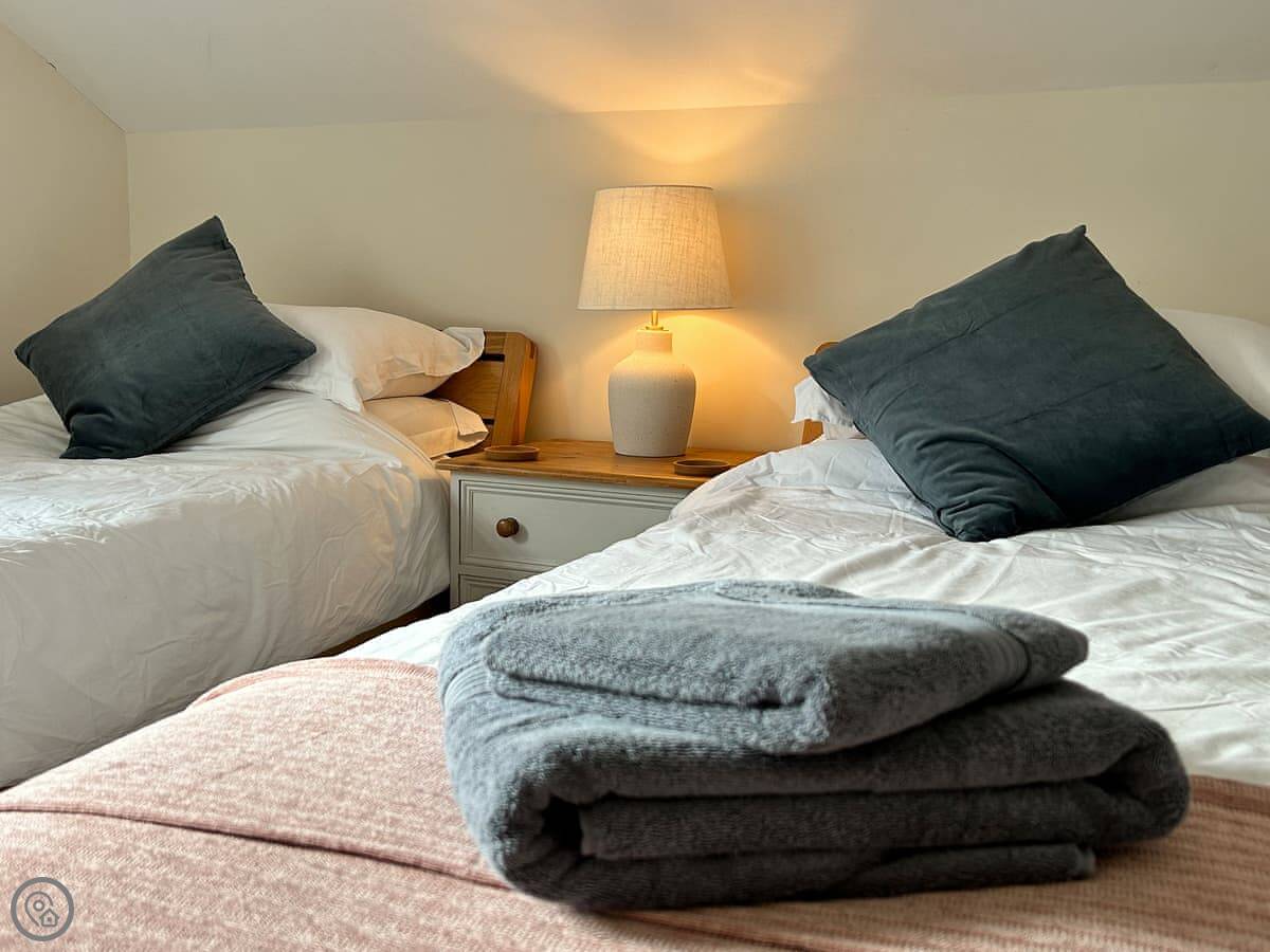 It sleeps four in two bedrooms. One with a king size bed, one with two singles. One bathroom upstairs, and a separate toilet downstairs. It's got a 4 Star rating. It was all renovated last autumn, so everything's fresh and clean. It's open plan upstairs so it feels quite light. The living area's at the back with big windows looking over the garden.