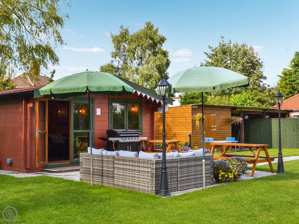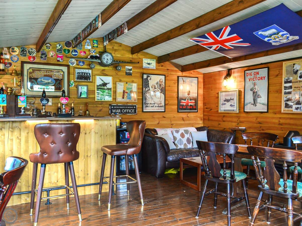 You get the patio area to yourself. The big thing here is the garden pub. It's a heated log cabin we built, with a projector and Wi-Fi. It's for guests to use. It's bring your own drink. We open it when we can, mostly weekends and evenings, but it's not on a strict timetable. If we're around and you're here, it'll probably be open.