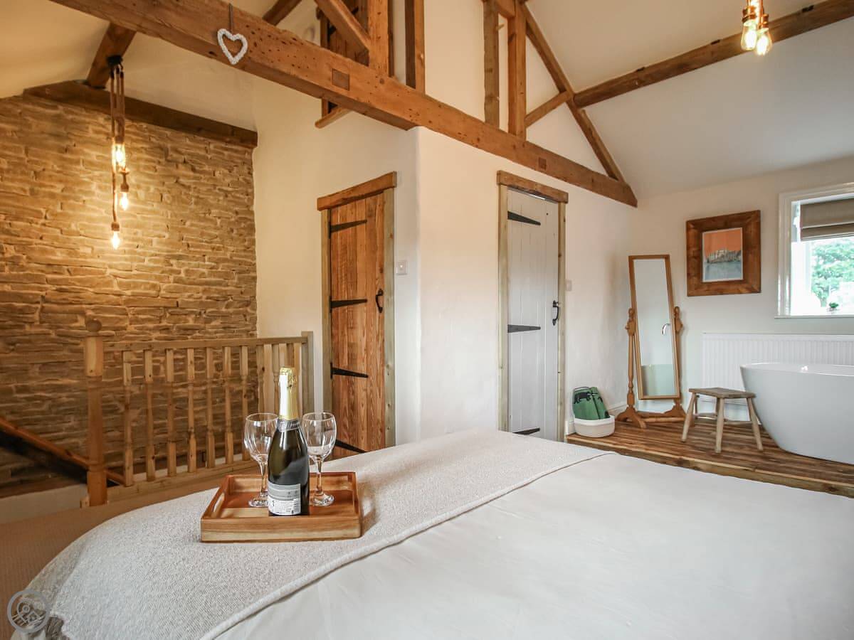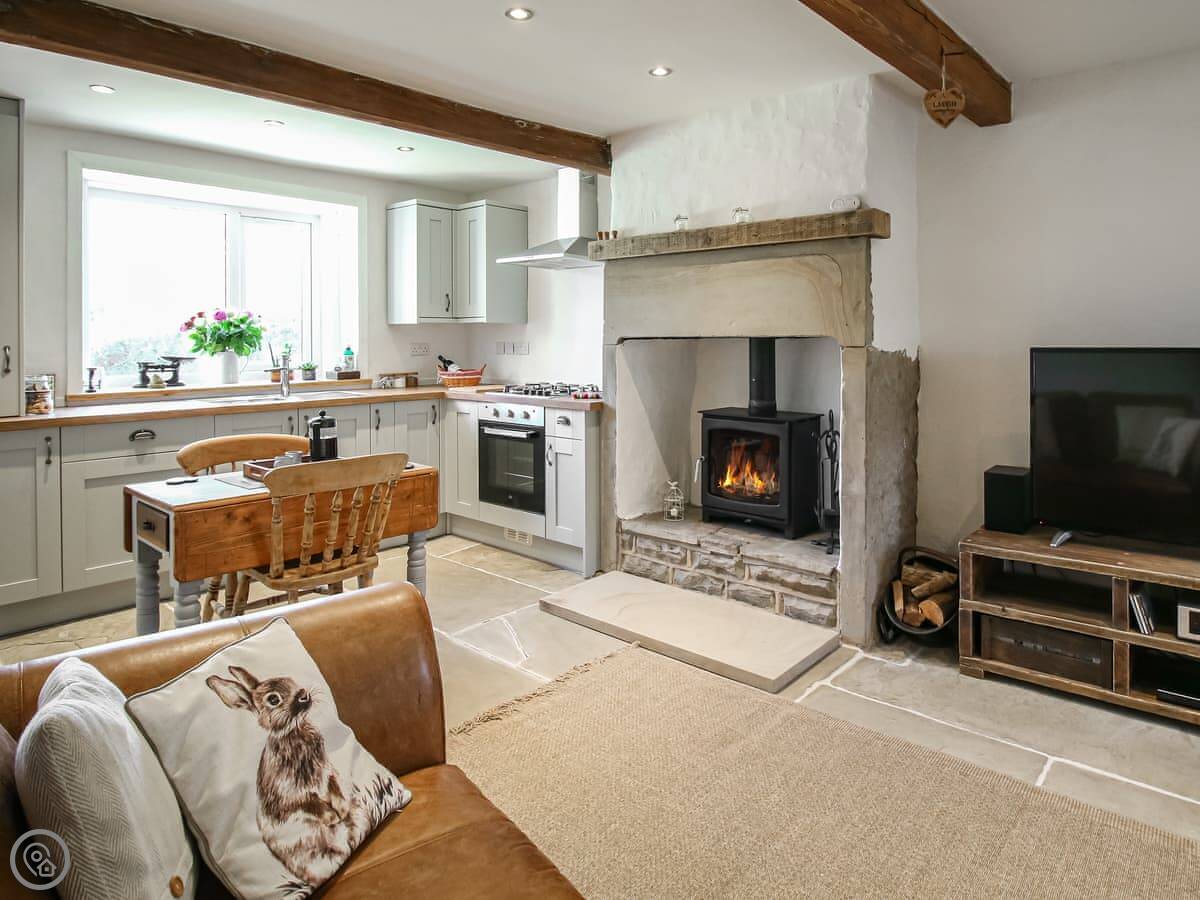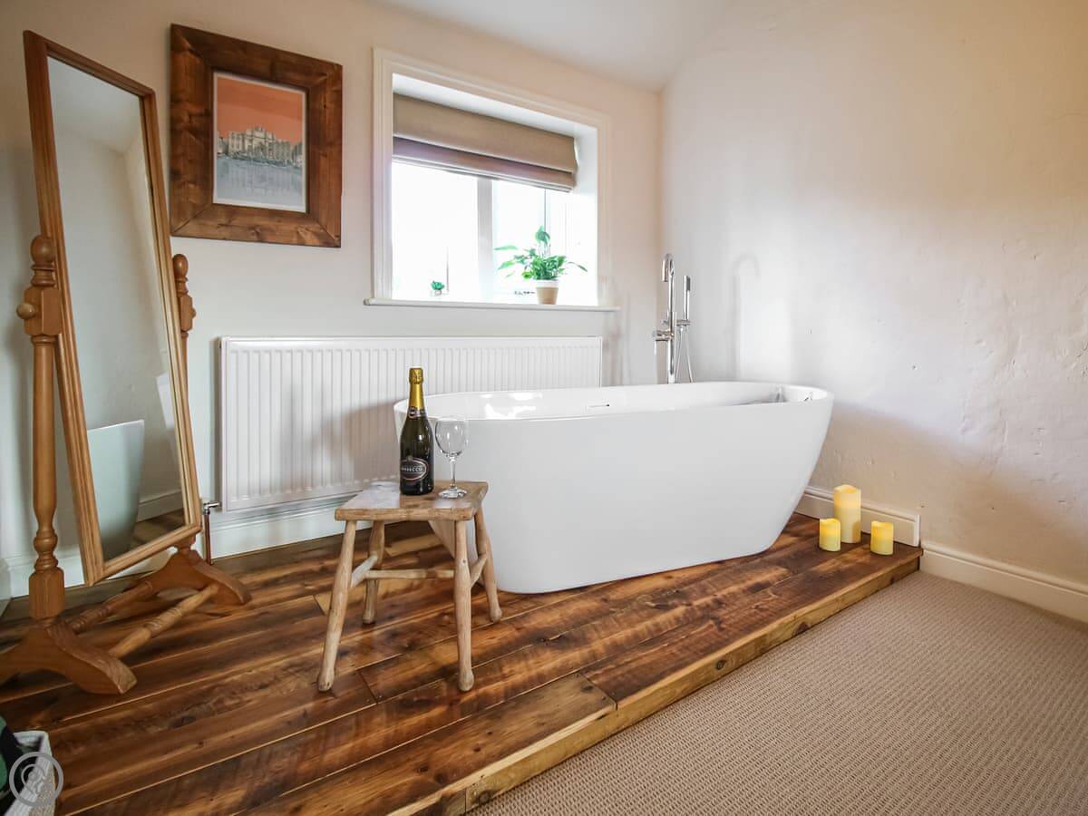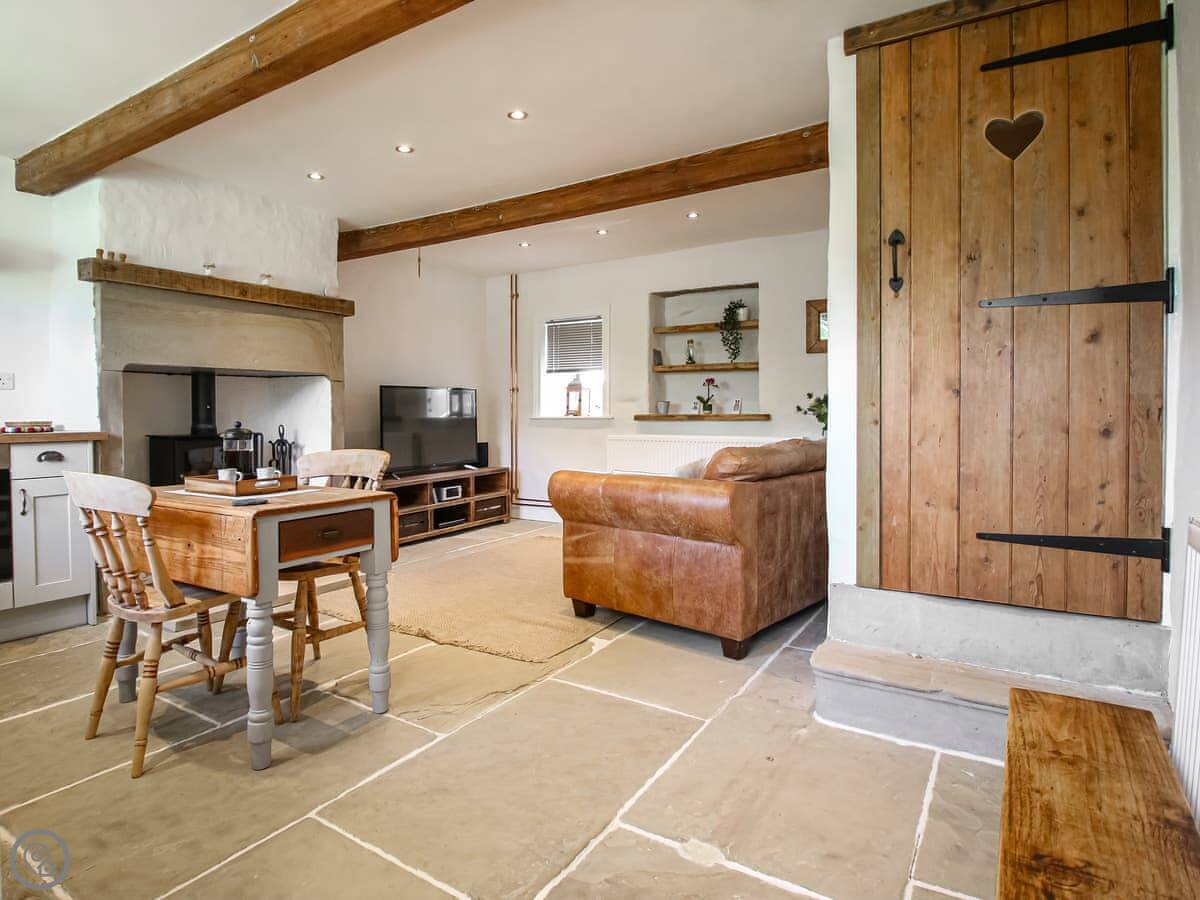 The cottage was done up in 2023. It's got stone floors downstairs and a wood burner. Upstairs, there's a freestanding bath in the bedroom. You get a view of the fields and the Emley Moor Mast.