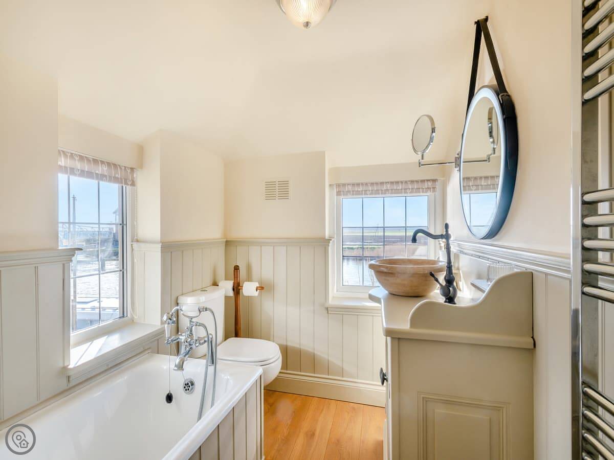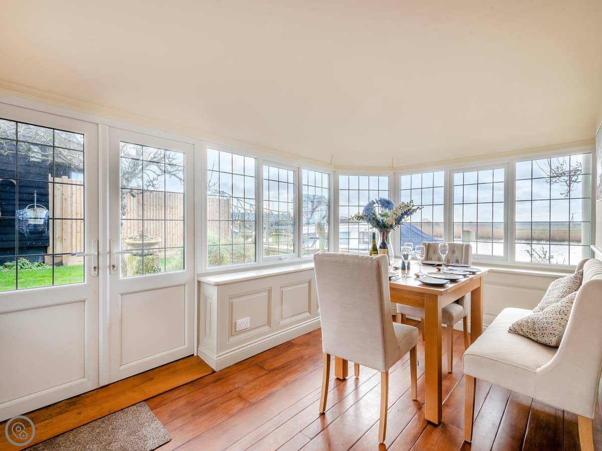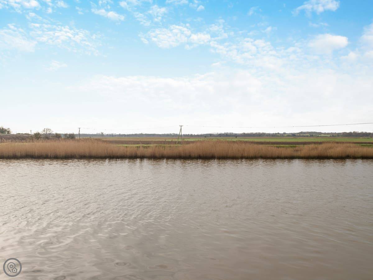 The main thing here is the view. You look straight out over the river and the marshes opposite. You see boats going by, birds, sometimes deer over the other side. The living space is open plan, with doors out to a sunroom and the garden.