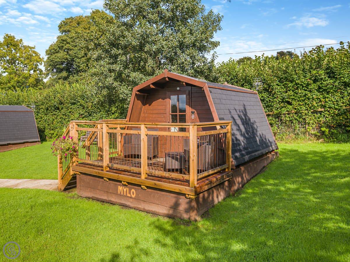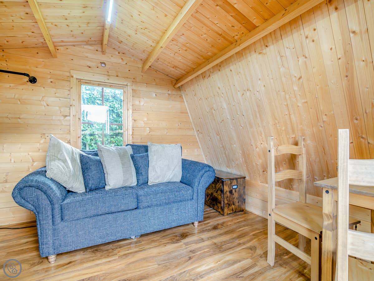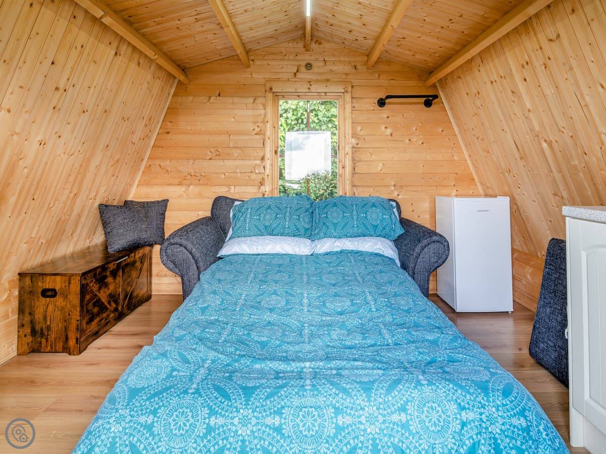 It sleeps two on a sofa bed in the one room. There's a separate shower and toilet in a little block a few steps away. It's got a 4 Star rating. It's clean and modern, but compact. The decking outside is private and looks over the fields.