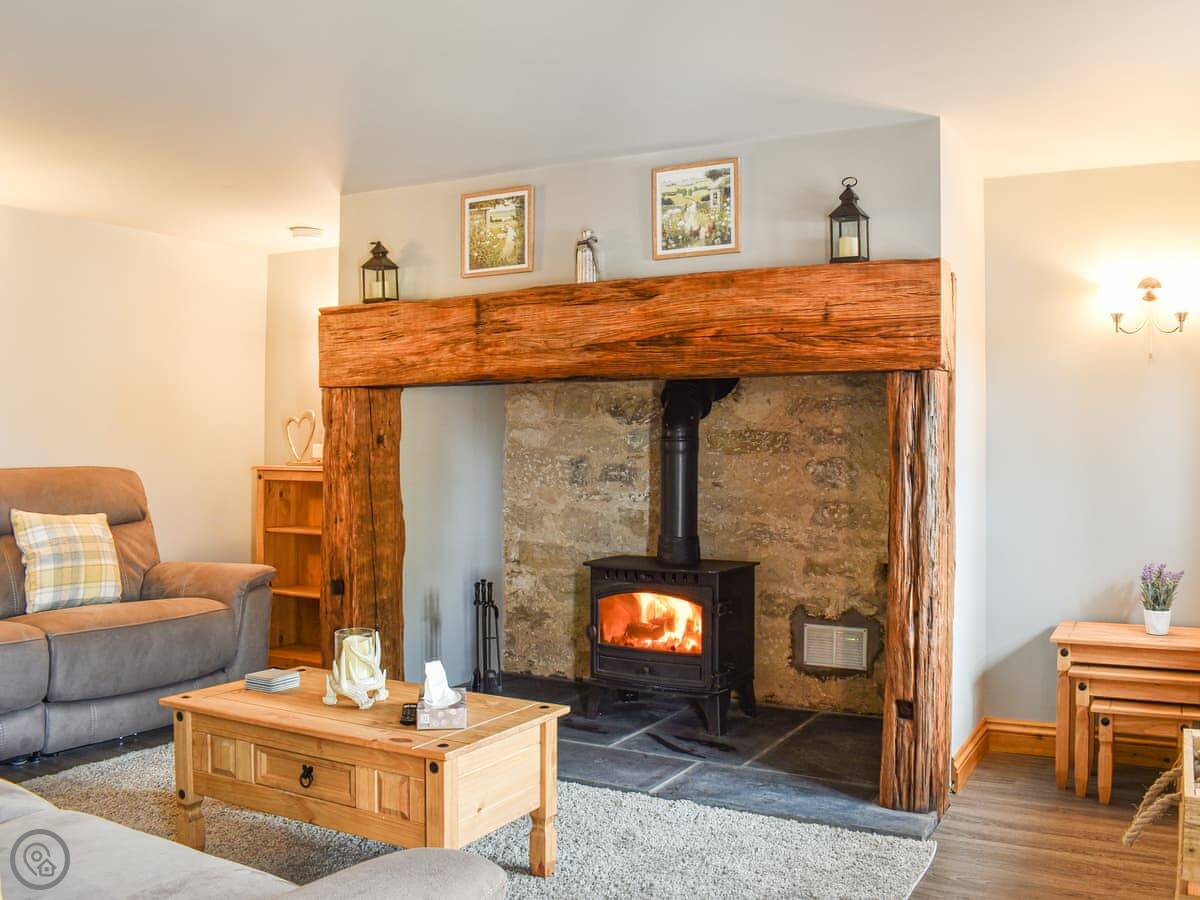The set up is a bit different. It's all open plan downstairs with the kitchen, dining area and living room in one big space. There's a wood burner in a large fireplace. The heating runs on a heat pump, so it's efficient.