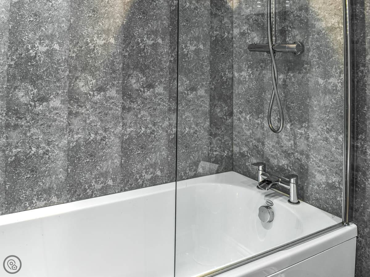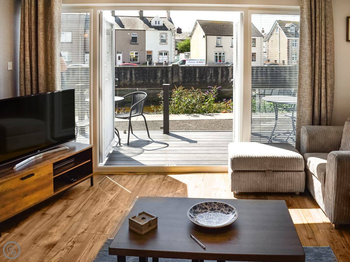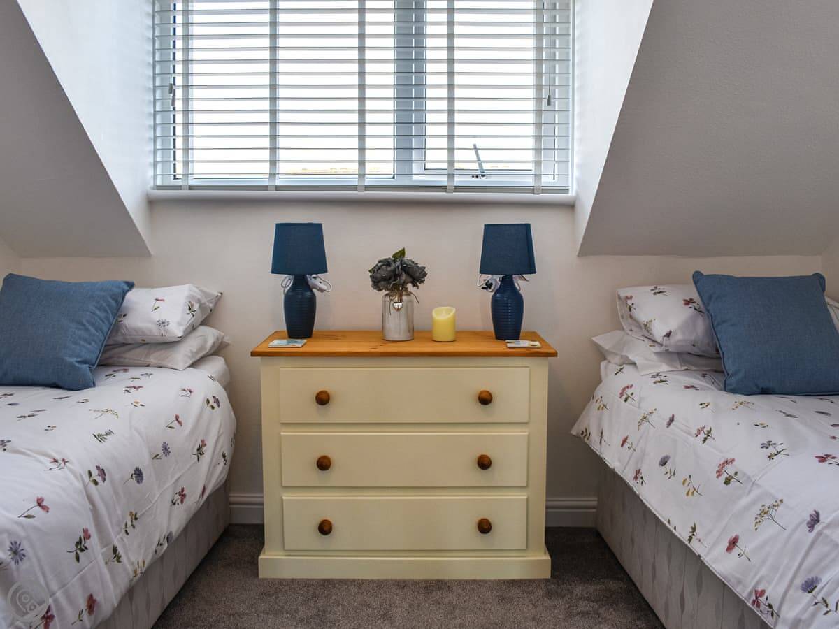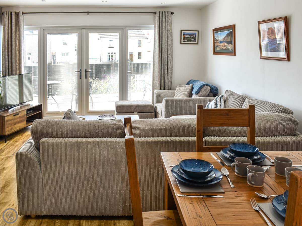 It sleeps four people. Two bedrooms upstairs, one double and one twin, and a family bathroom. It's got a 4 Star rating. The whole ground floor is open plan, so it's one space for the kitchen, dining, and living area. Doors lead out to a deck at the back.