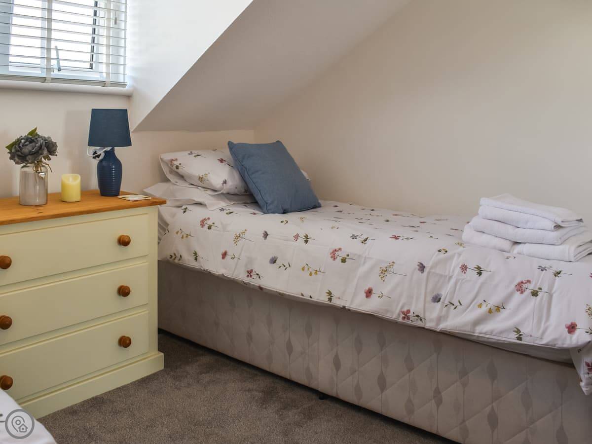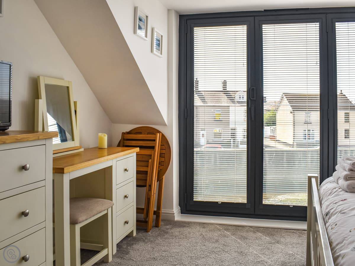 The main bedroom has bi-fold doors that open onto a small balcony. The view from there is over the fields and you can see the sea in the distance.