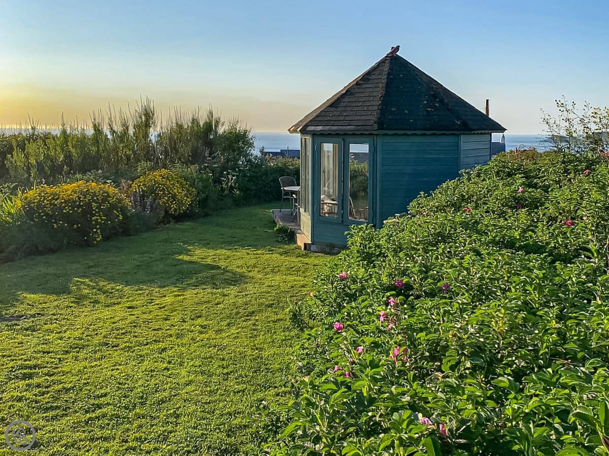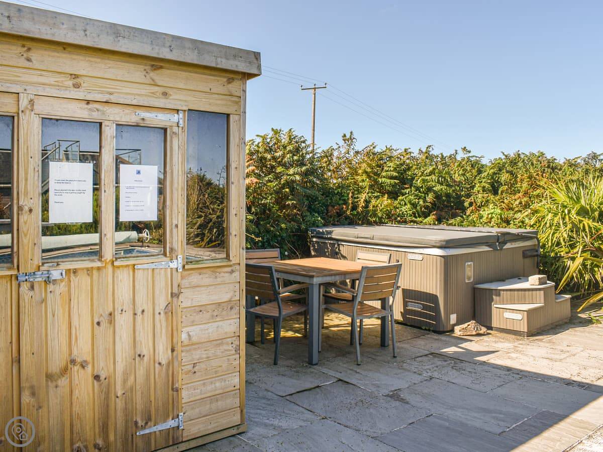 The main thing is the garden and the views. There's a good sized garden with lawns and shrubs. There's a roof terrace you can sit on and look out over the fields. There's a swimming pool and a hot tub. There's also a summerhouse if you want some shade or shelter.