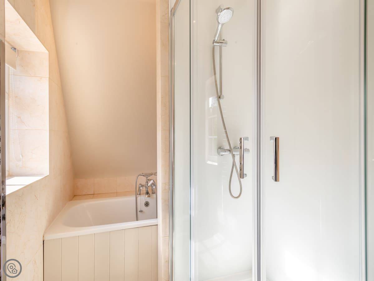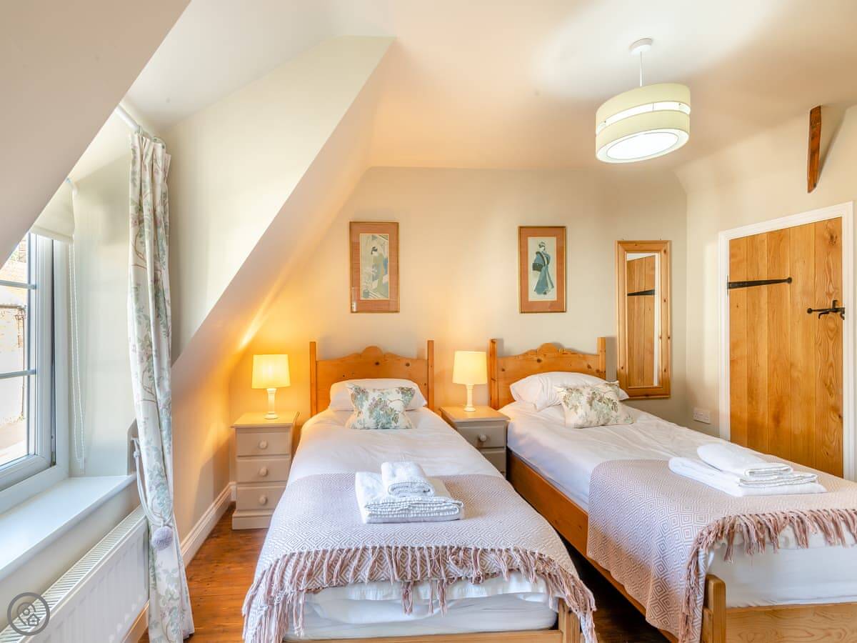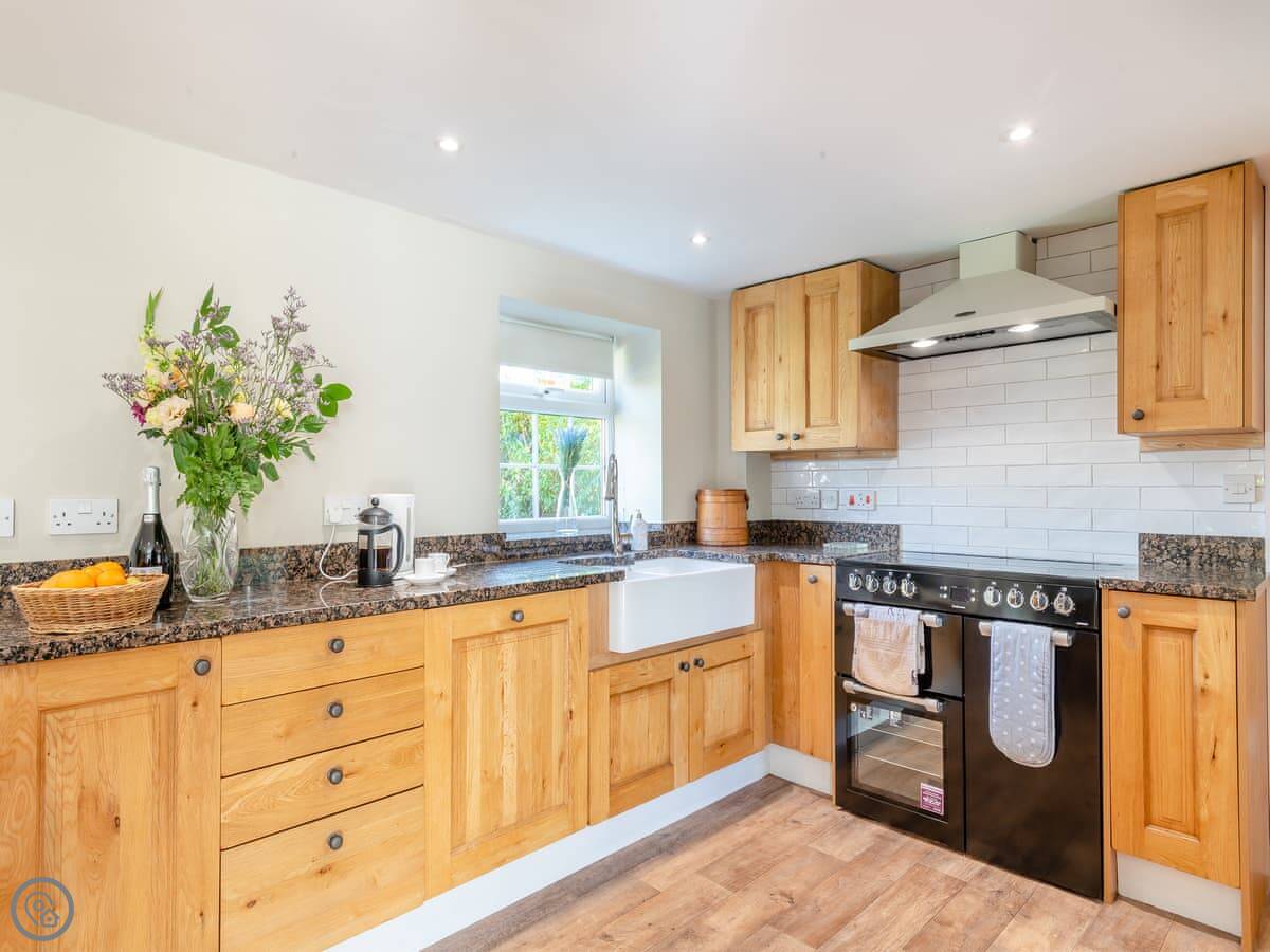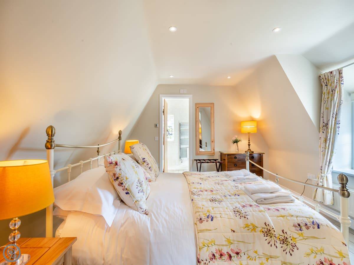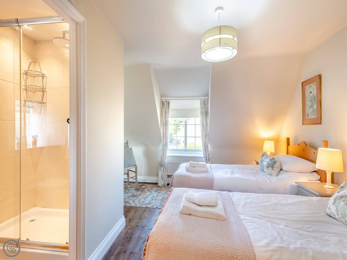 It’s got a 5 Star rating. It’s been well looked after and is comfortable. The kitchen and living area are open plan downstairs. There’s a woodburning stove for colder nights. Both bedrooms are upstairs and each one has its own ensuite bathroom, which is handy.