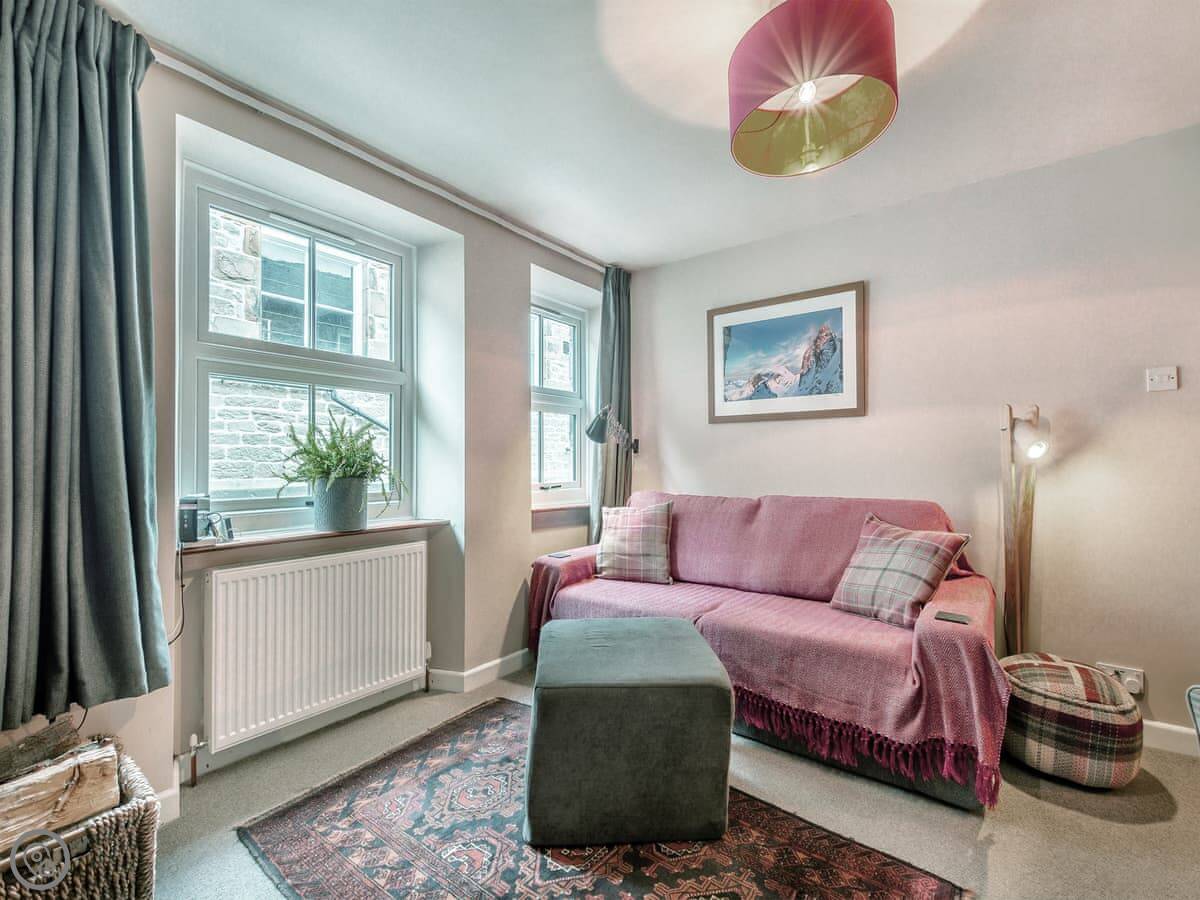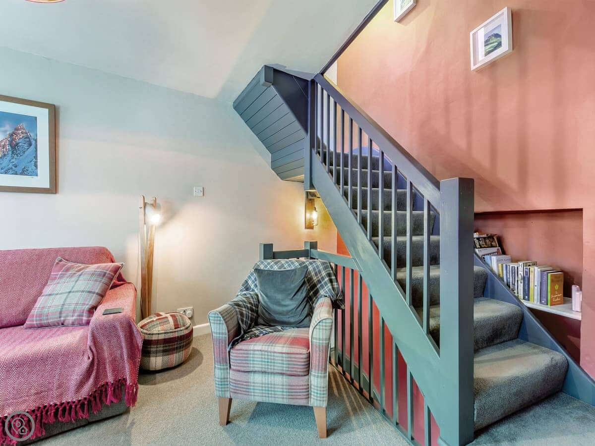 The layout is a bit unusual. You come into the lounge on the ground floor. Then the kitchen is downstairs, on the lower ground floor. The bedroom and bathroom are up on the first floor. The stairs are stone and quite steep in places, which is pretty standard for round here.