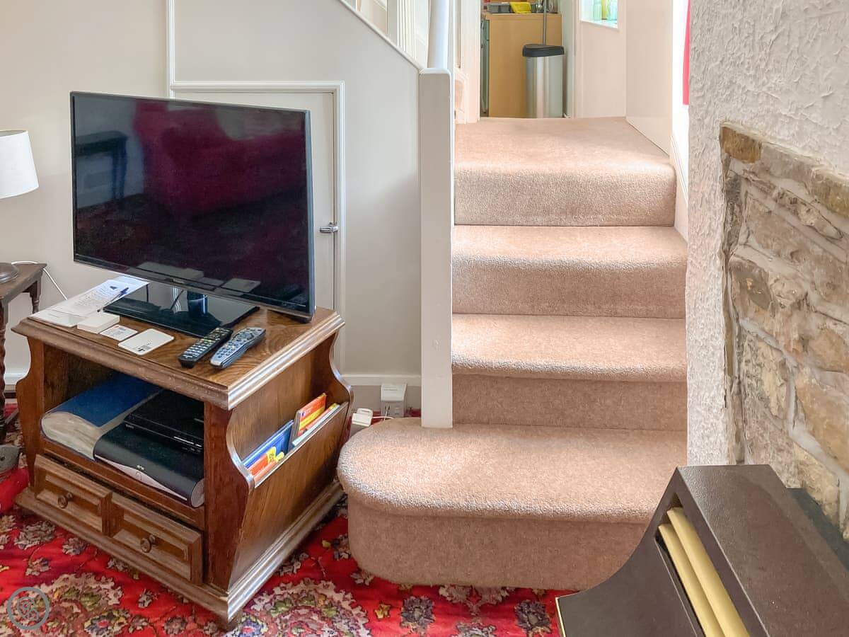 The stairs are steep. They're typical cottage stairs. The twin bedroom is on the first floor too, and has a door straight out to the towpath. The double bedroom and bathroom are on the top floor.