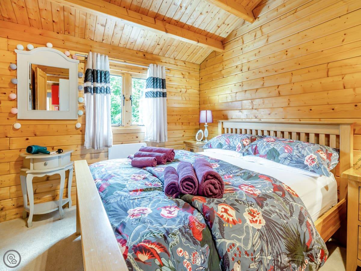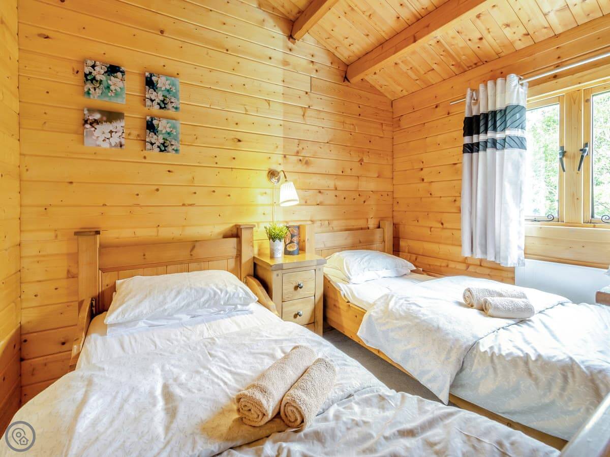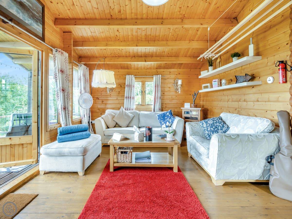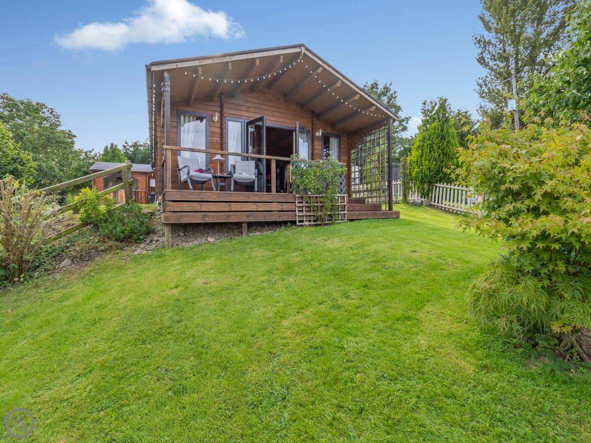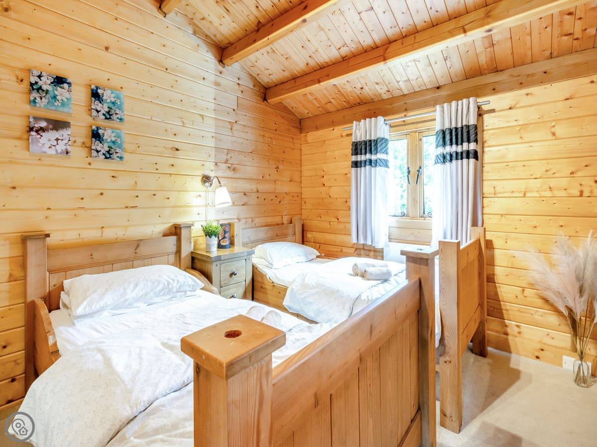 It sleeps four. Two bedrooms, one shower room. It's got a 4 Star rating. It's modern inside, new feeling. The log burner works well. The deck is good for sitting out if the weather plays ball. There's a lawn too.