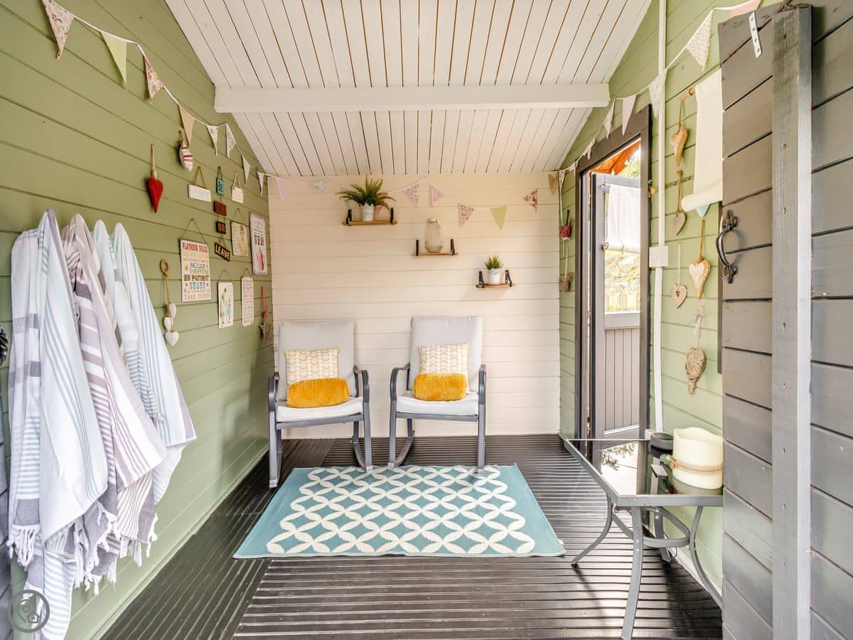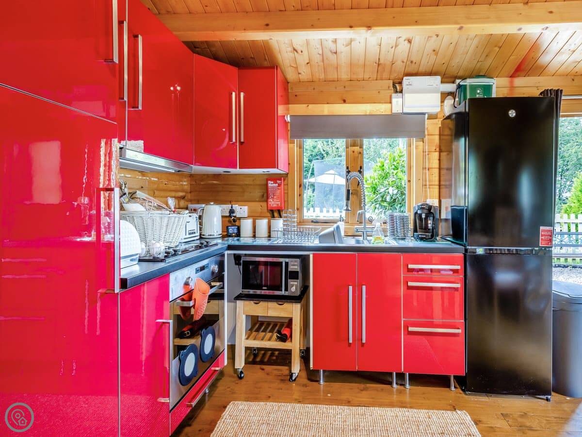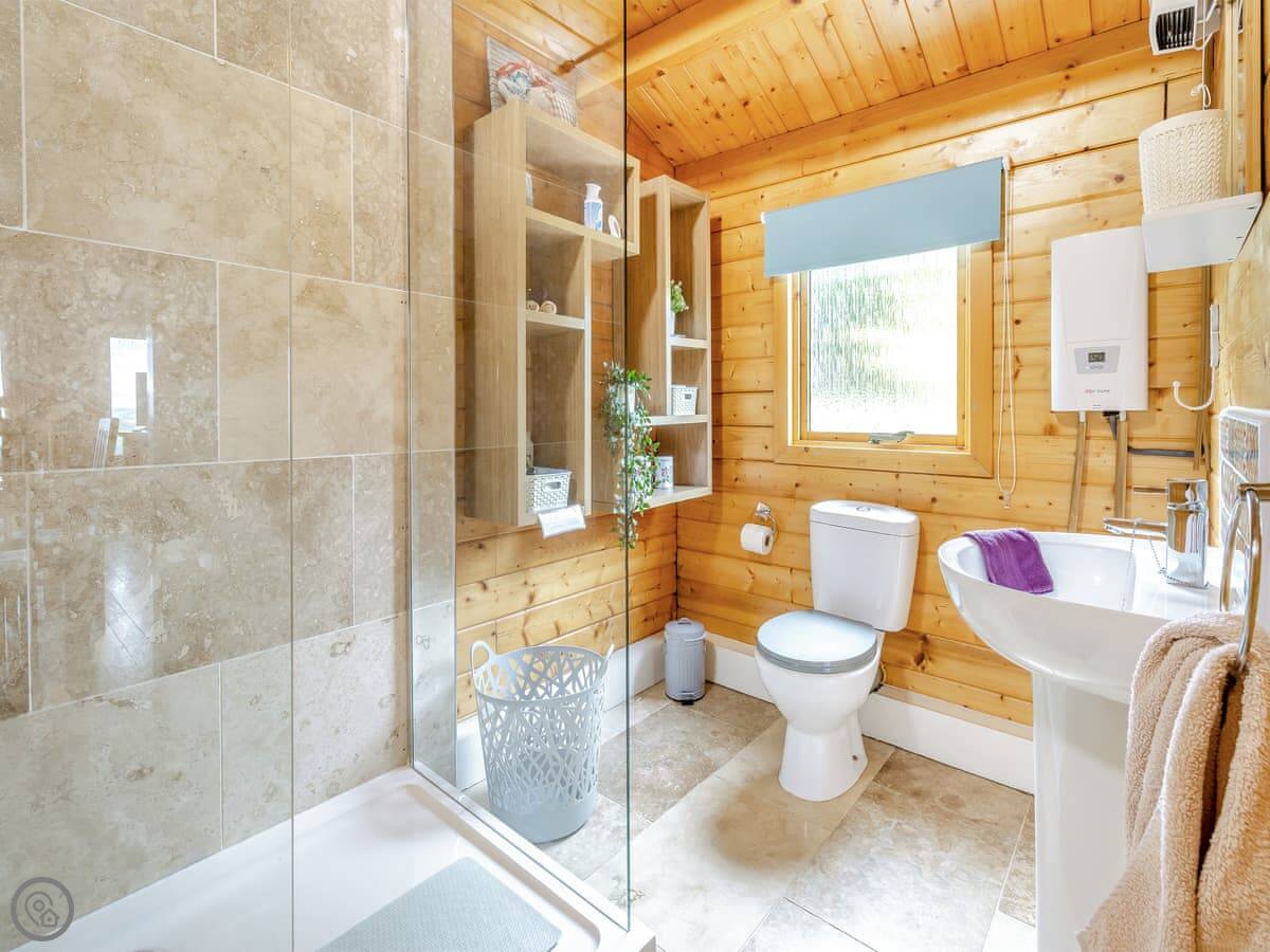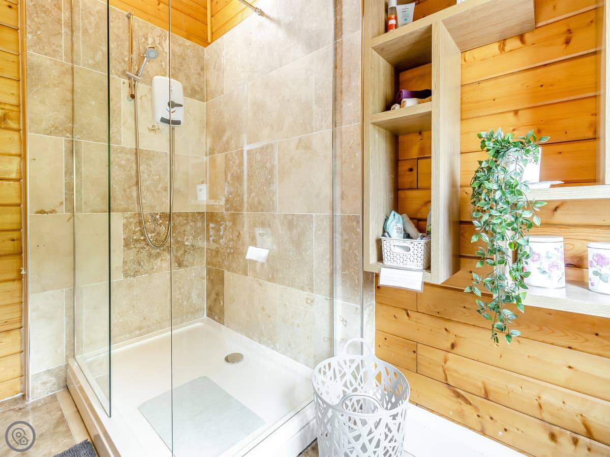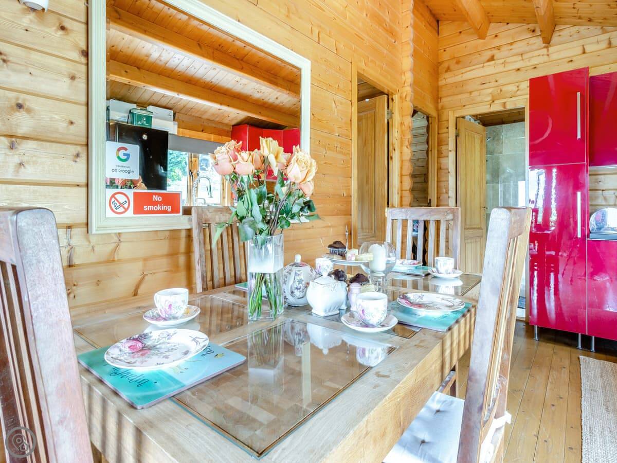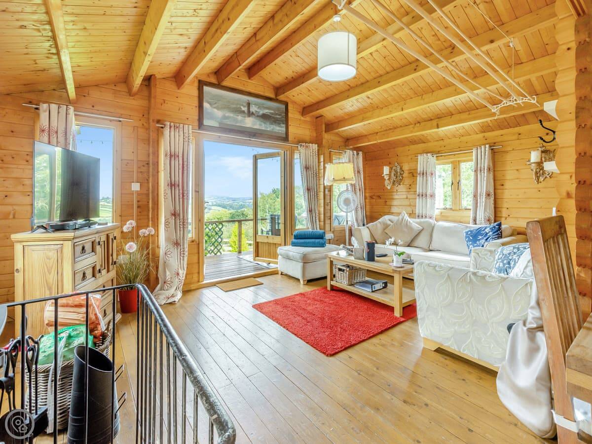 It sleeps four. Two bedrooms, one shower room. It's got a 4 Star rating. It's modern inside, new feeling. The log burner works well. The deck is good for sitting out if the weather plays ball. There's a lawn too.