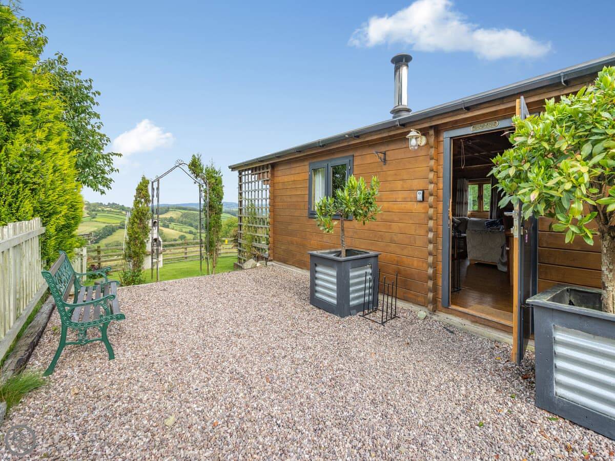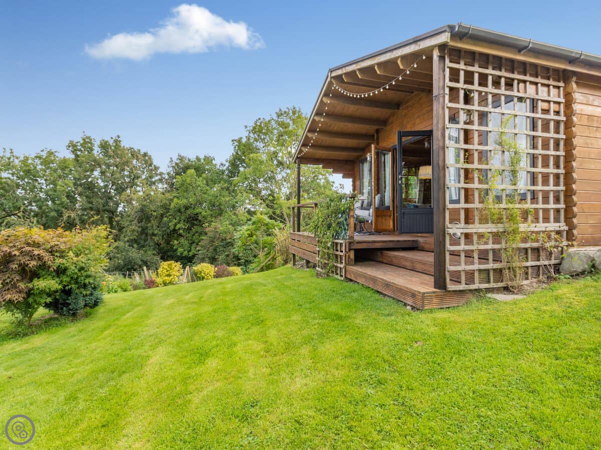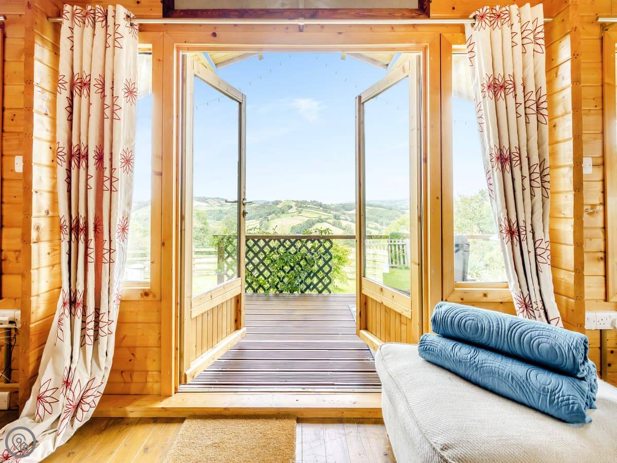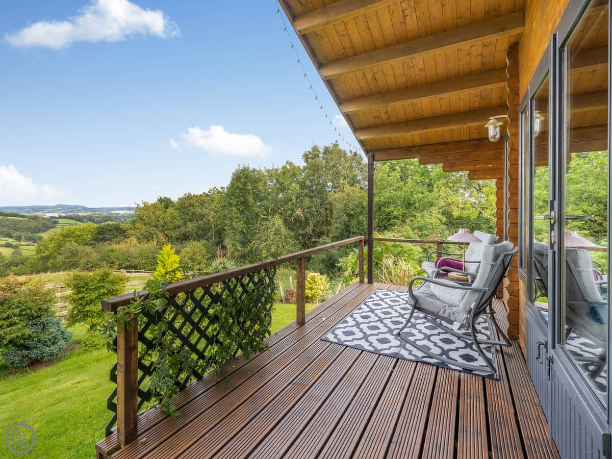 The Cabin Cefn Mawr is in Cefn Mawr, near Newtown. It's a detached lodge. You're on your own up here, set back off the lane. The view from the deck is over fields and hills. It's quiet.