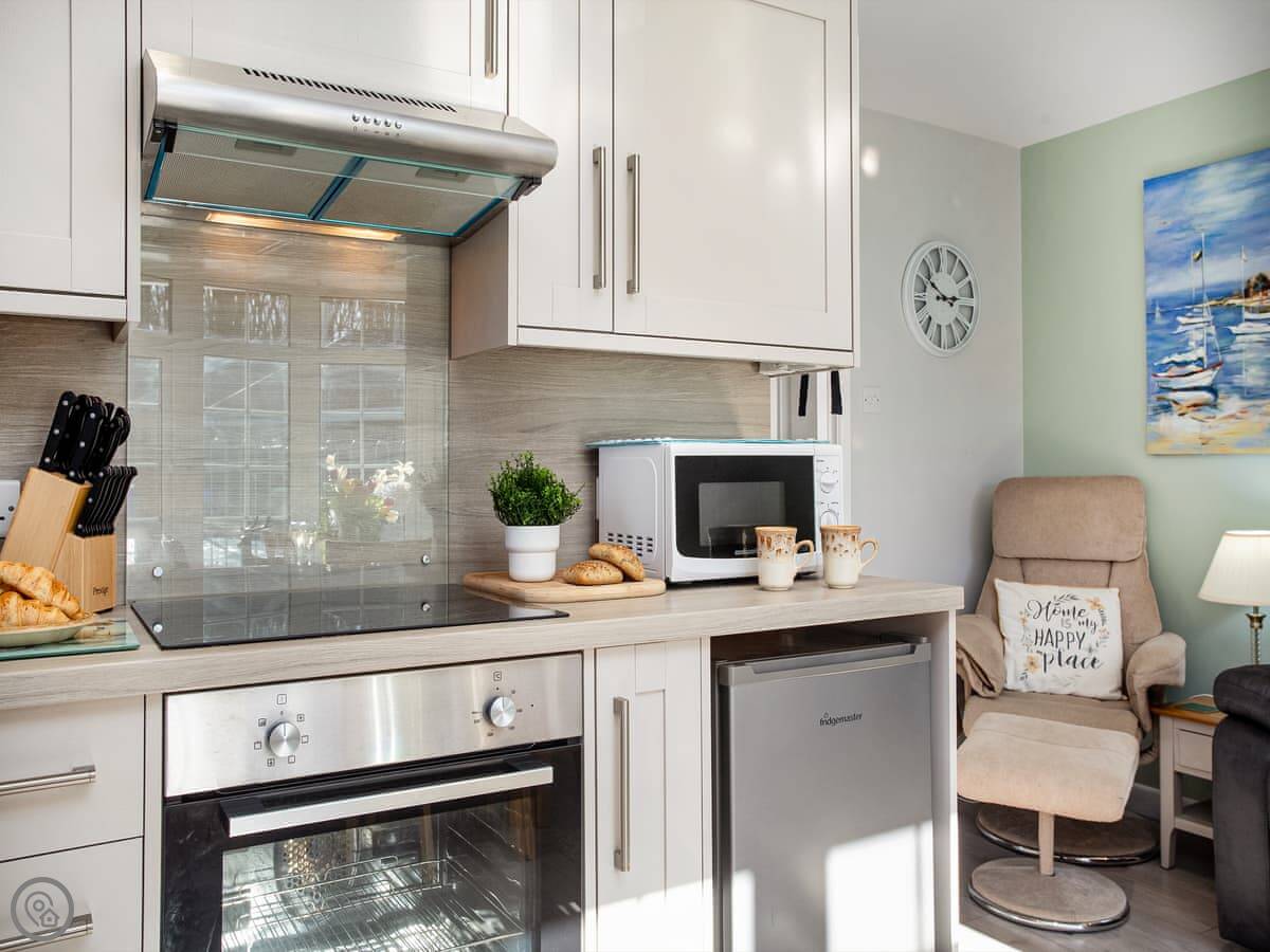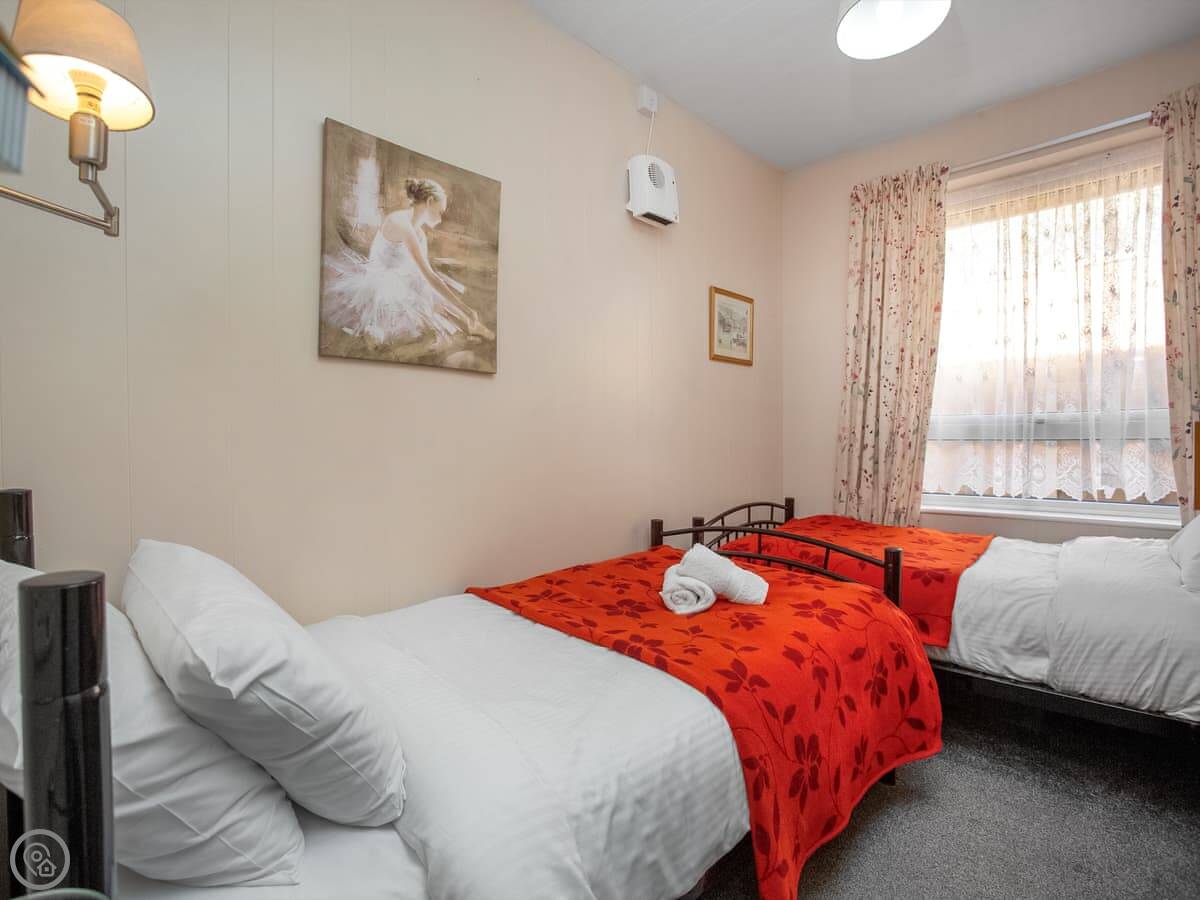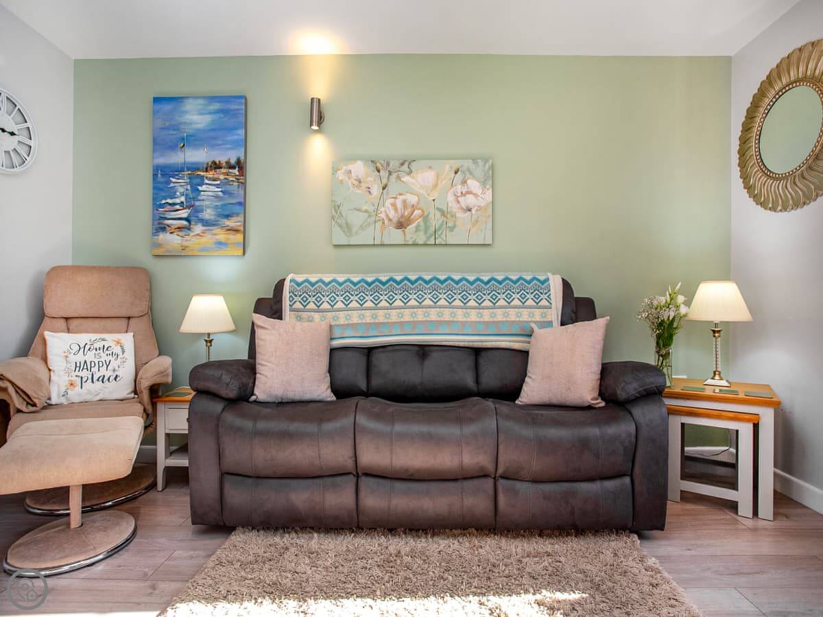 It sleeps four. Two bedrooms: one double, one twin. One bathroom with a shower. It has a 4 Star rating. The layout is open-plan, so the kitchen, dining and sitting area are all in one room.