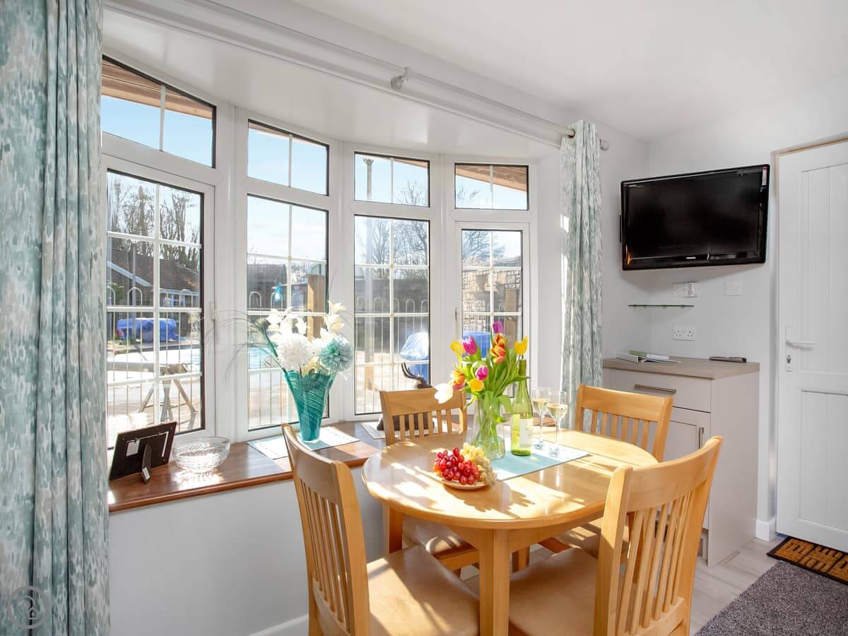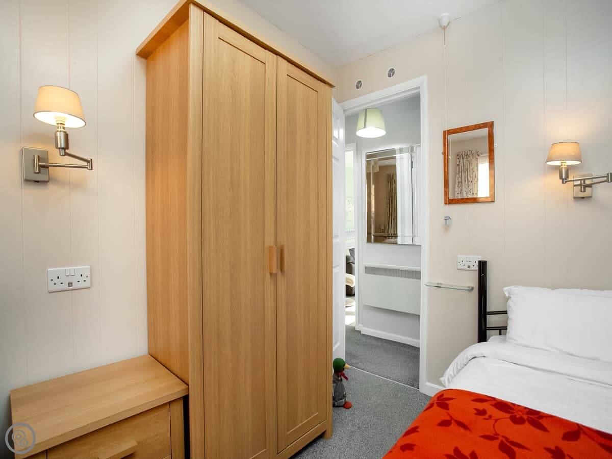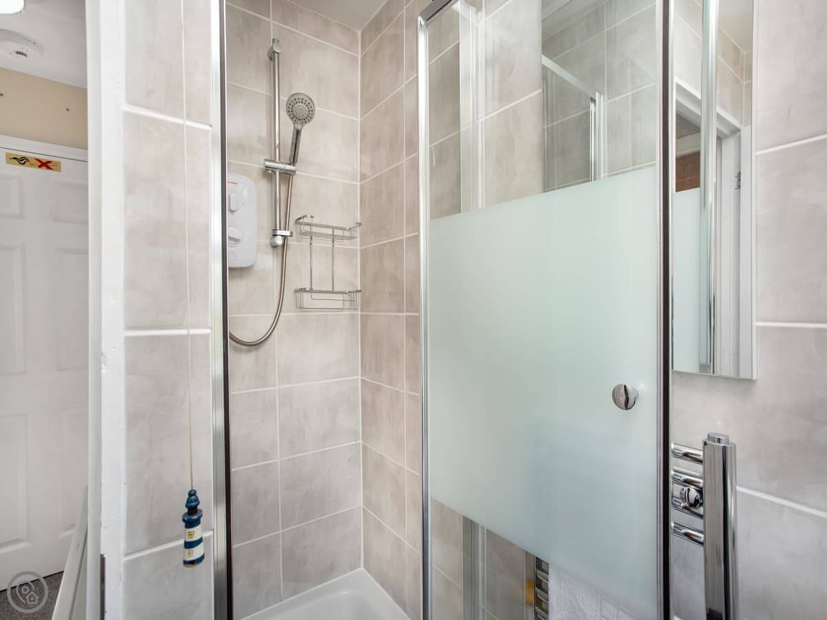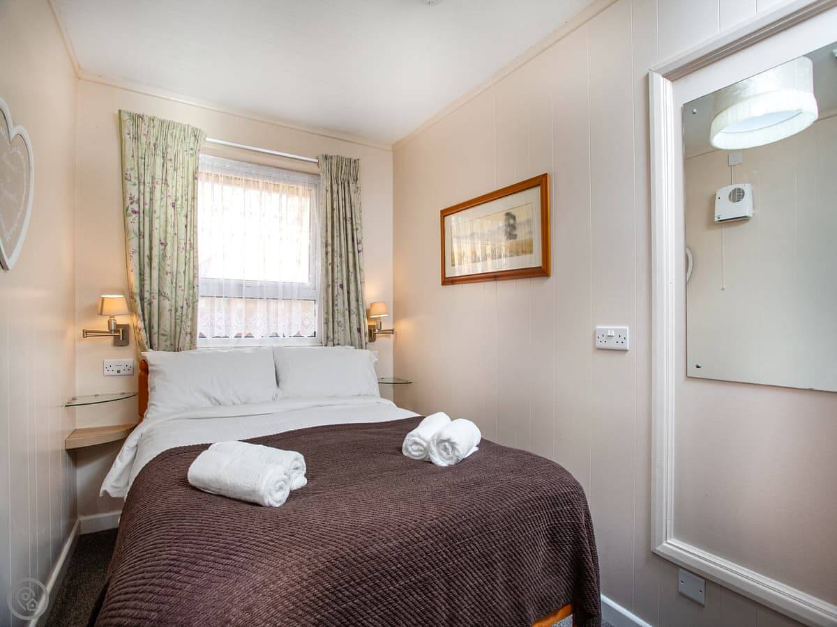 It sleeps four. Two bedrooms: one double, one twin. One bathroom with a shower. It has a 4 Star rating. The layout is open-plan, so the kitchen, dining and sitting area are all in one room.