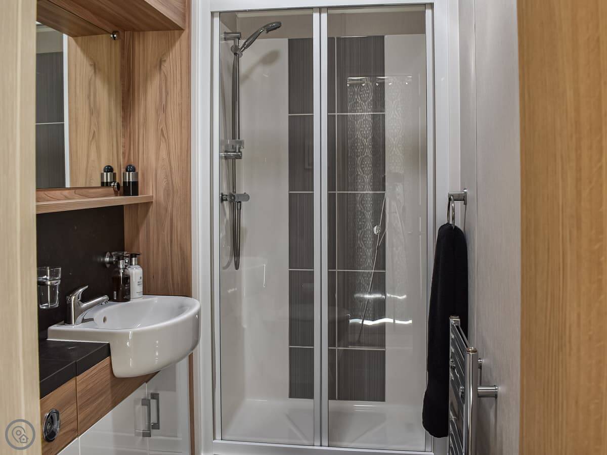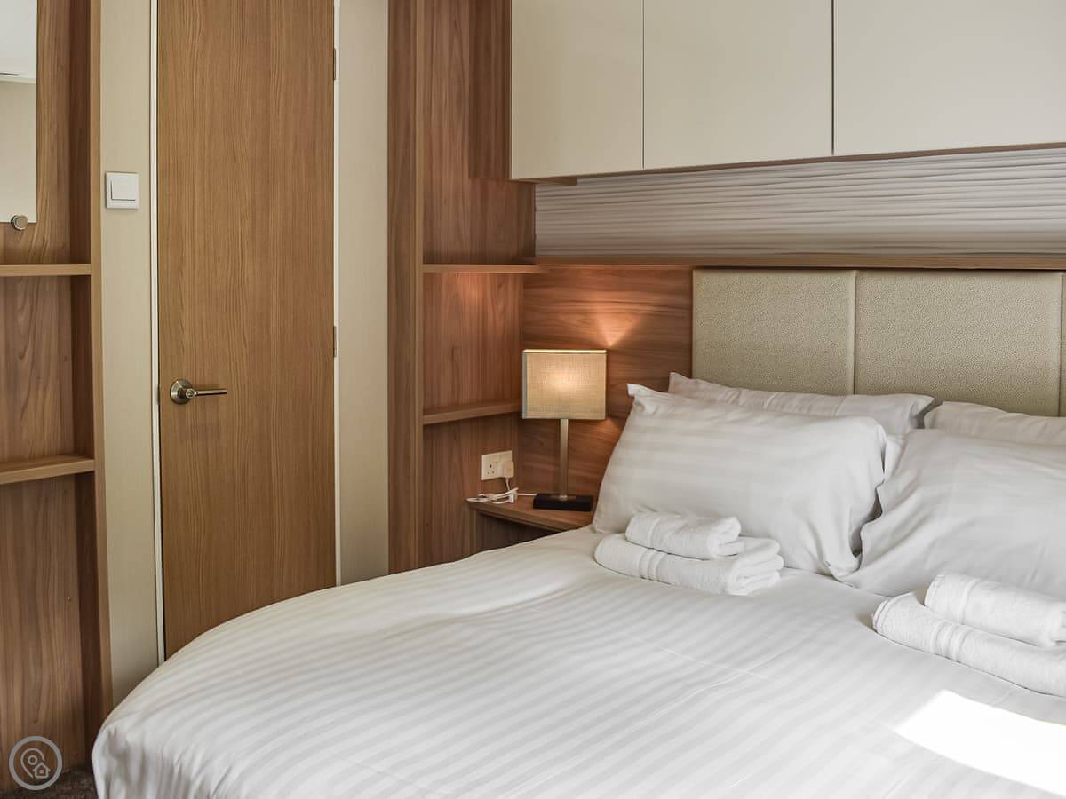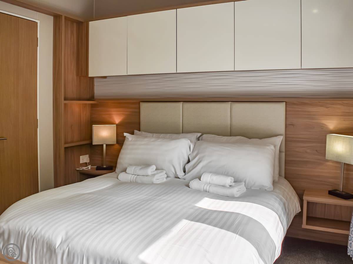 It sleeps six but there are only two bedrooms, so you need to be friends or family who don't mind sharing. One double, one twin, and the sofa bed in the lounge. One bathroom, plus an en-suite shower in the main bedroom. It's a 4 Star, so it's good condition, newer appliances.