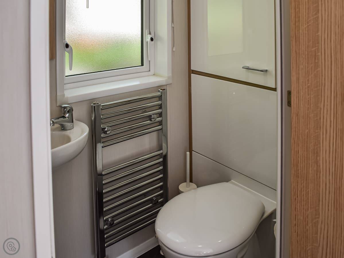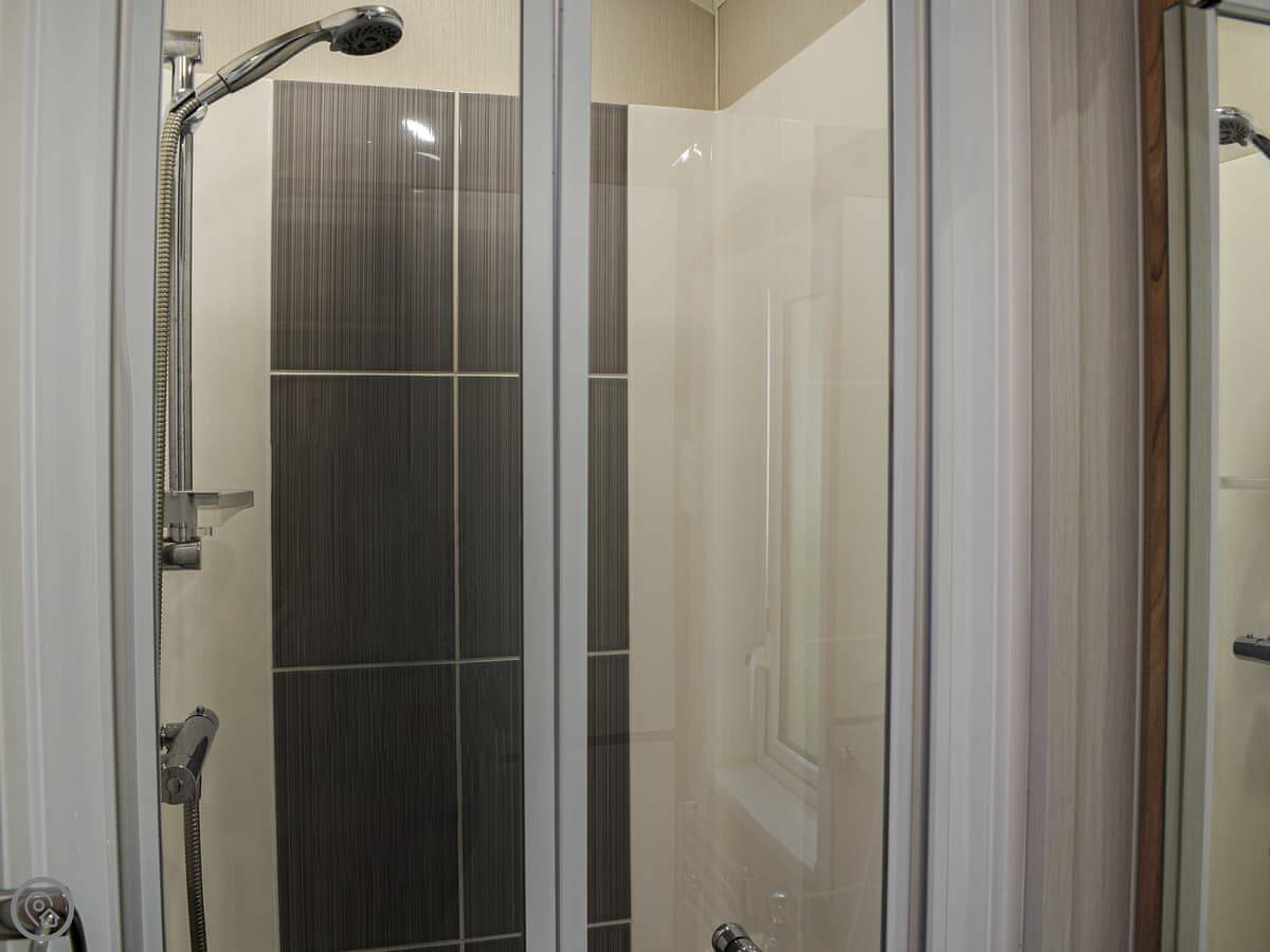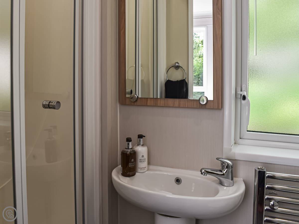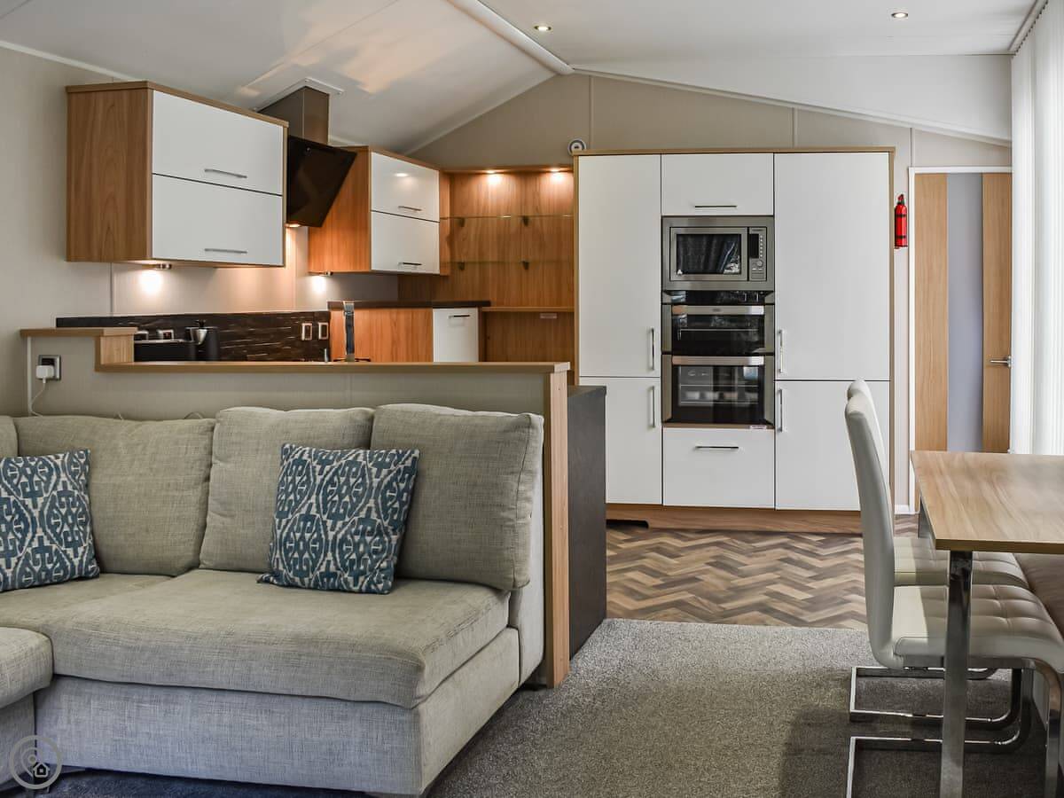 It sleeps six but there are only two bedrooms, so you need to be friends or family who don't mind sharing. One double, one twin, and the sofa bed in the lounge. One bathroom, plus an en-suite shower in the main bedroom. It's a 4 Star, so it's good condition, newer appliances.