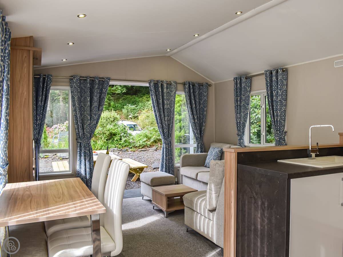 It's all open plan inside. The kitchen has a dishwasher. There's central heating for cooler days. A TV and WiFi. Bedding and towels are included.