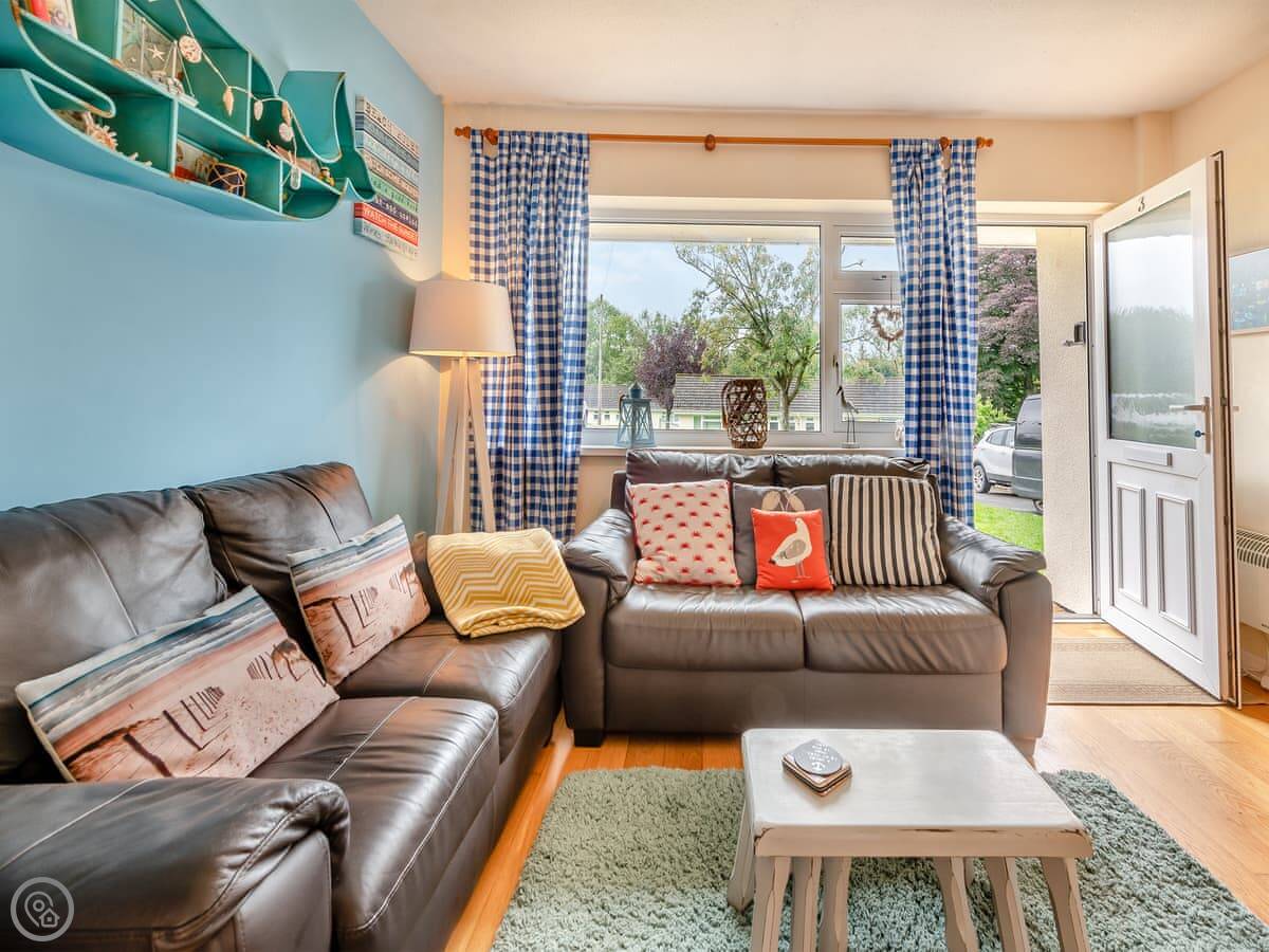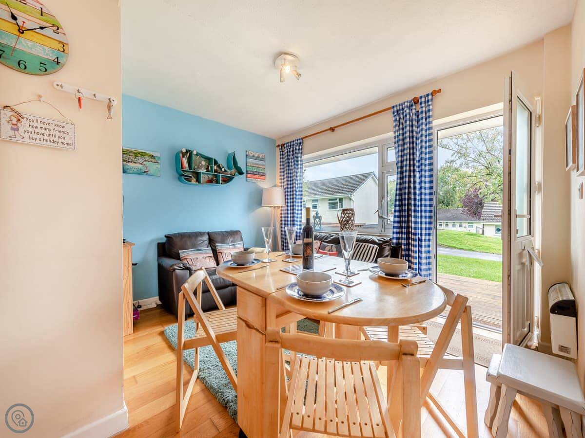 The layout is all open-plan. You walk into the kitchen, dining and living area as one room. The back garden is a proper lawn, fully enclosed, good if you've got dogs or kids. Out the front there's a decked bit with a table and chairs, then a bit of lawn as well. It's good for the morning sun.