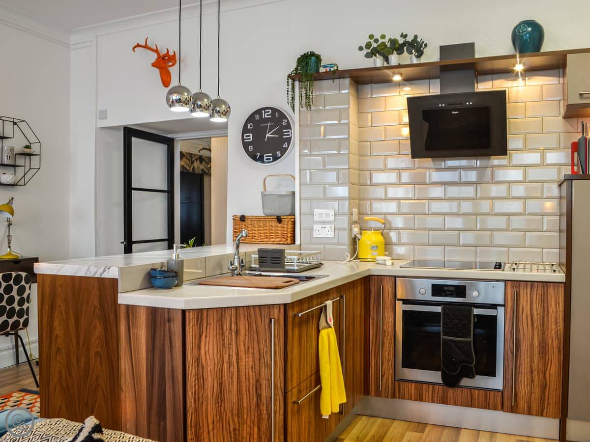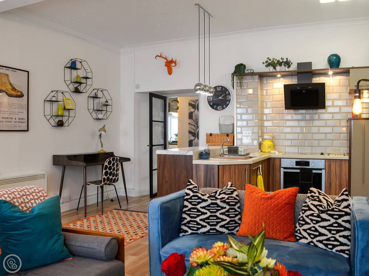 The main room is open plan, with the kitchen, dining and living area all together. There's a wood-burning stove that works fine and warms the whole place up. The windows are big, so it gets a lot of light. At the back, there's a small sunroom off the kitchen, which is a nice spot to sit.