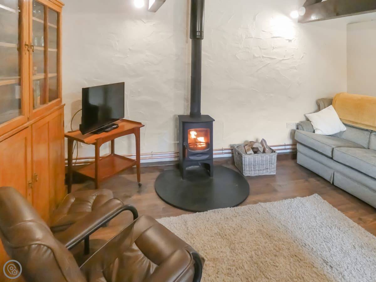 It sleeps five in three bedrooms. There are two bathrooms, which is useful. It's a 4 Star place, so it's comfortable and well kept. The main living space is open-plan, kitchen and dining together, with a separate lounge that has a wood burner. There's a charge for logs beyond the first basket.