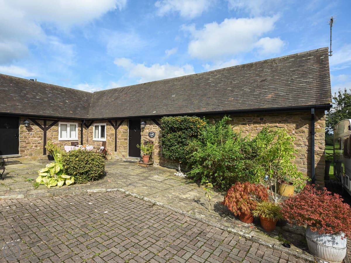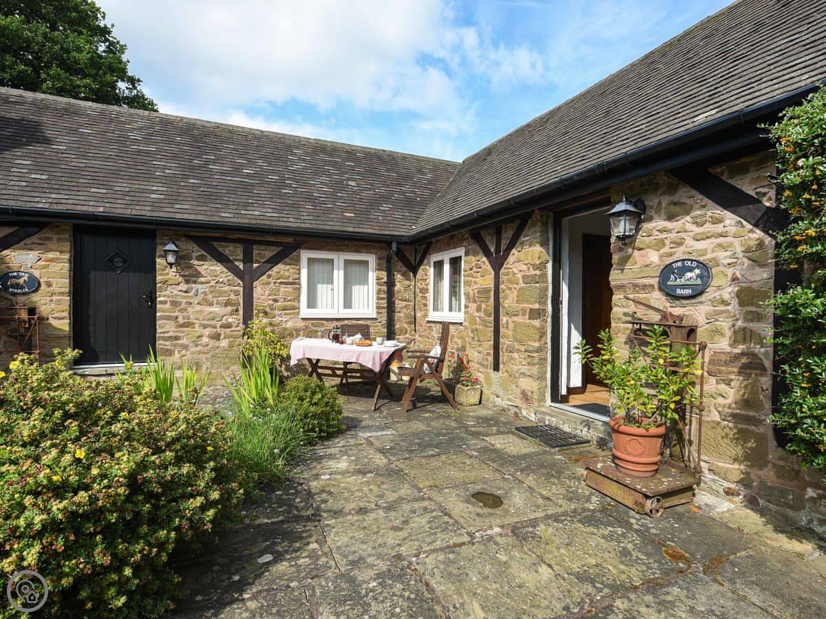 The Old Barn is off the main road between Hope Bowdler and Church Stretton. It's a detached stone barn conversion. You're down a track, so it's quiet. The garden looks out over fields.