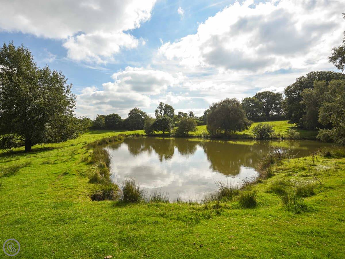 The garden has a paved area with a table and chairs. There are two fishing ponds on the land. You can fish for carp and tench, but there's a separate charge for that, paid to us when you're here. You can walk around them or have a picnic, but they are deep and there's no fence, so you need to watch children.